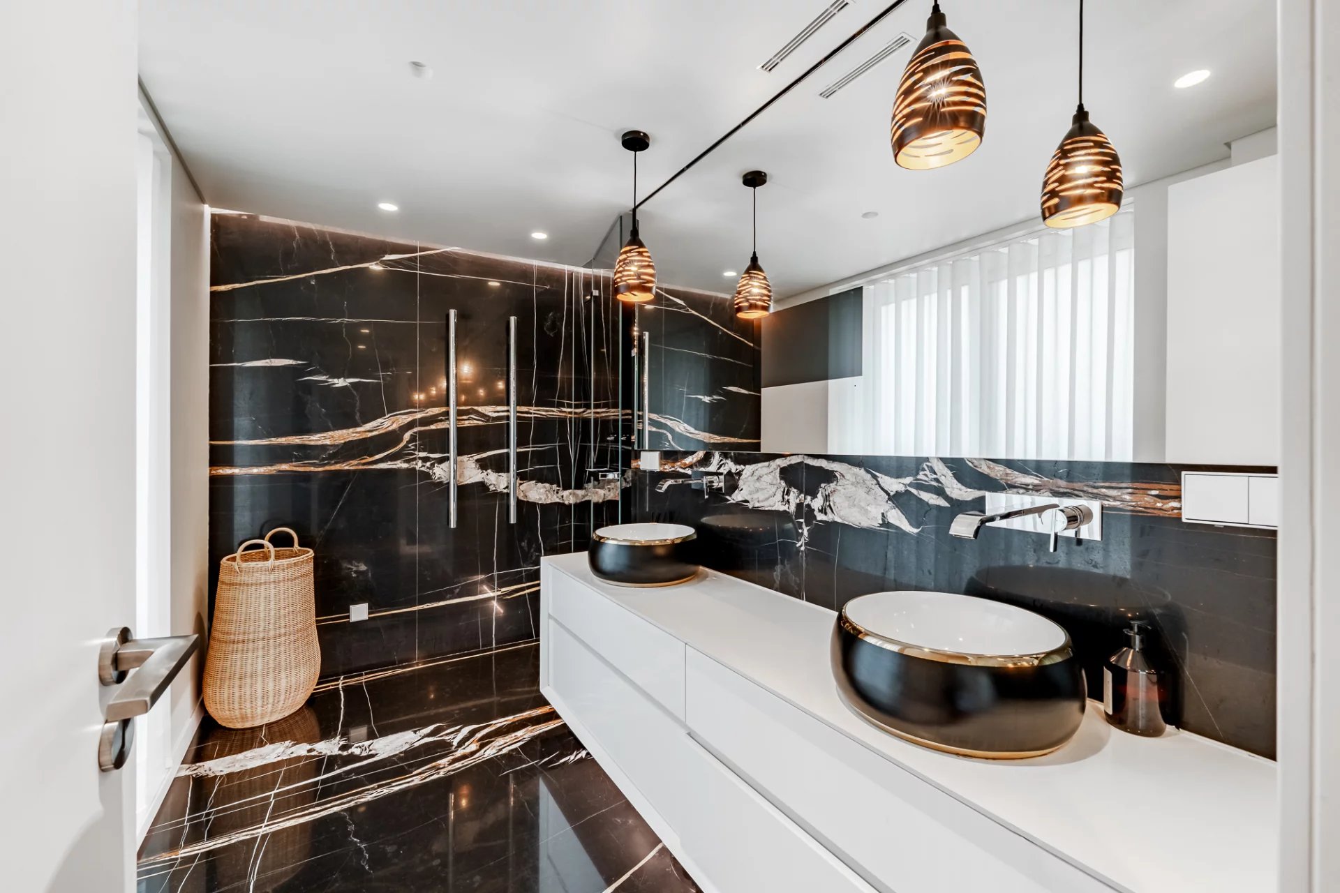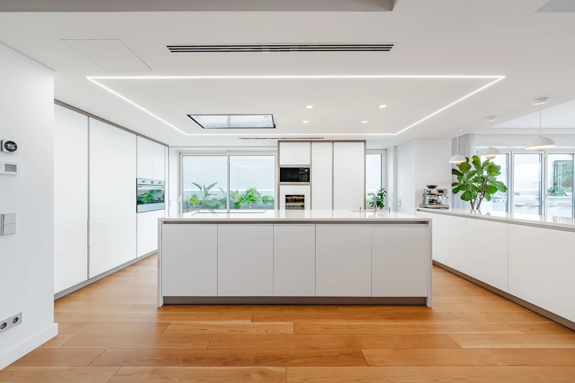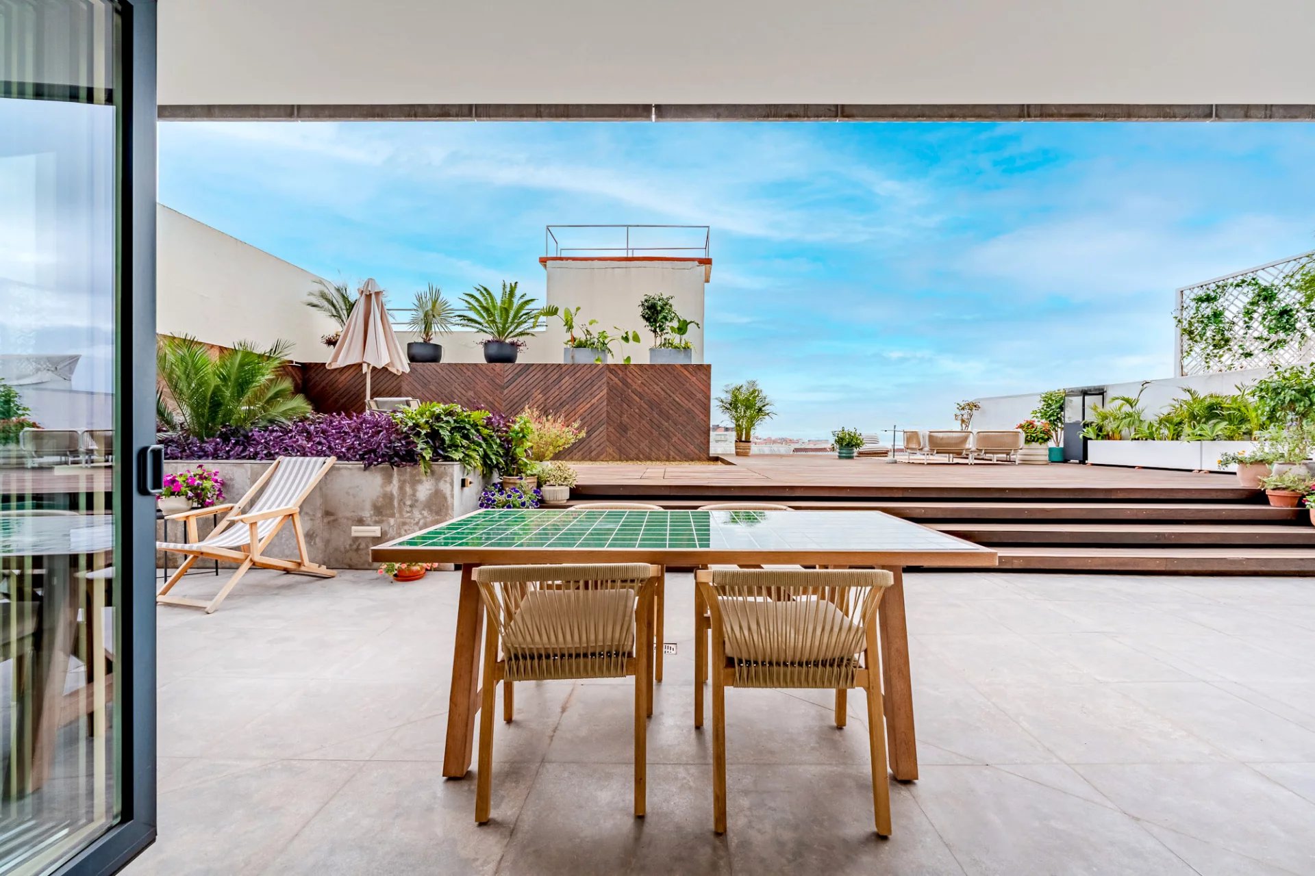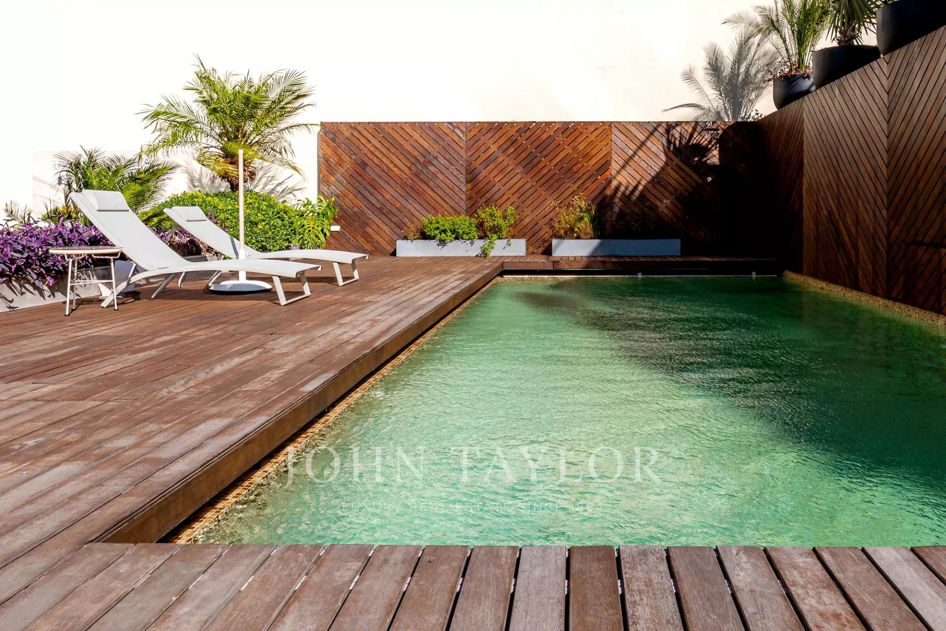 O apartamento dispõe de cinco quartos em suite, uma ampla sala de estar e jantar em open space, e uma cozinha totalmente equipada. No terraço, uma segunda cozinha de apoio permite usufruir em pleno das refeições ao ar livre com vista sobre o rio. As amplas janelas envidraçadas, do chão ao teto, inundam os interiores de luz natural e oferecem uma ligação direta ao exterior e à paisagem envolvente.