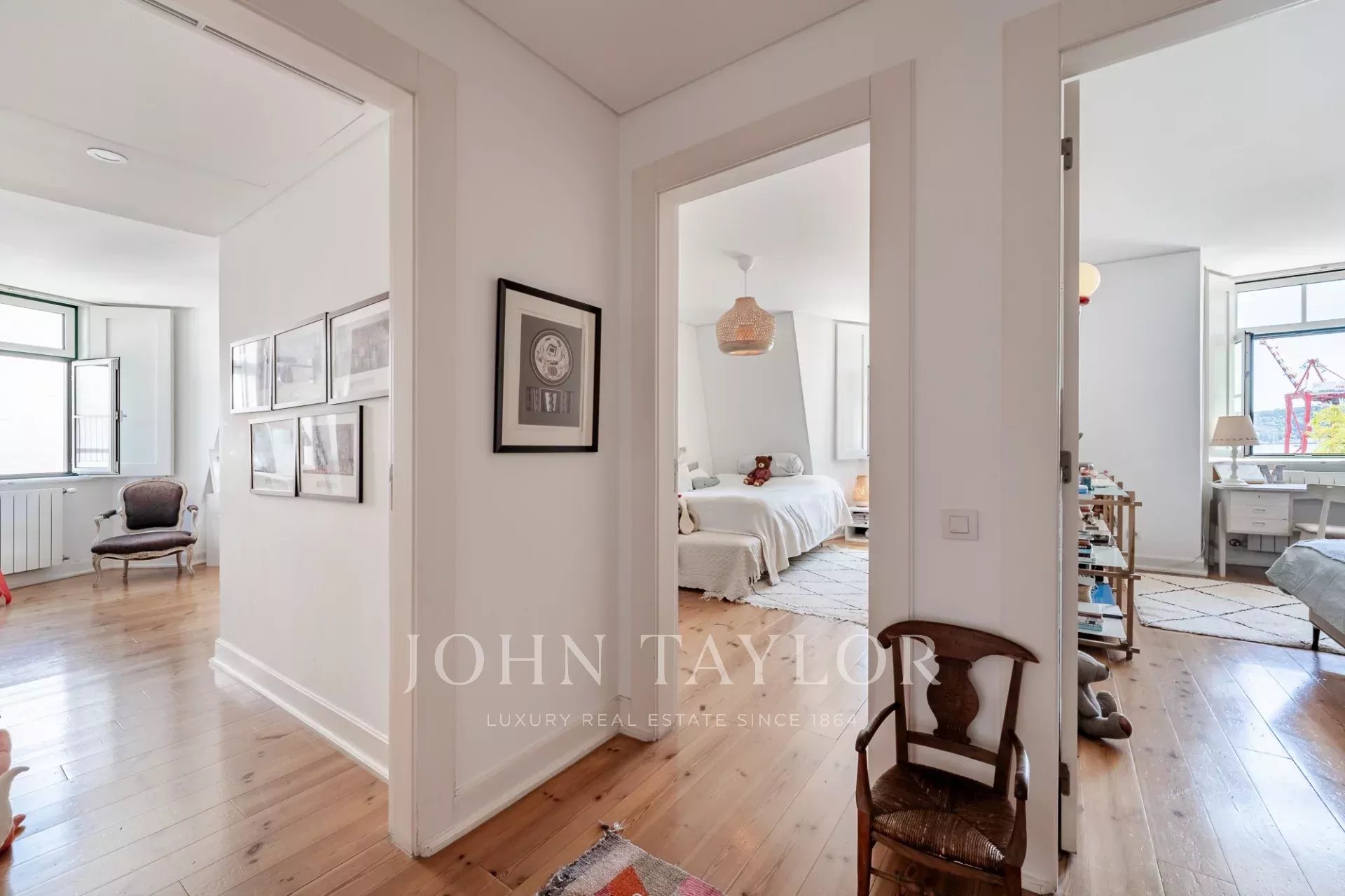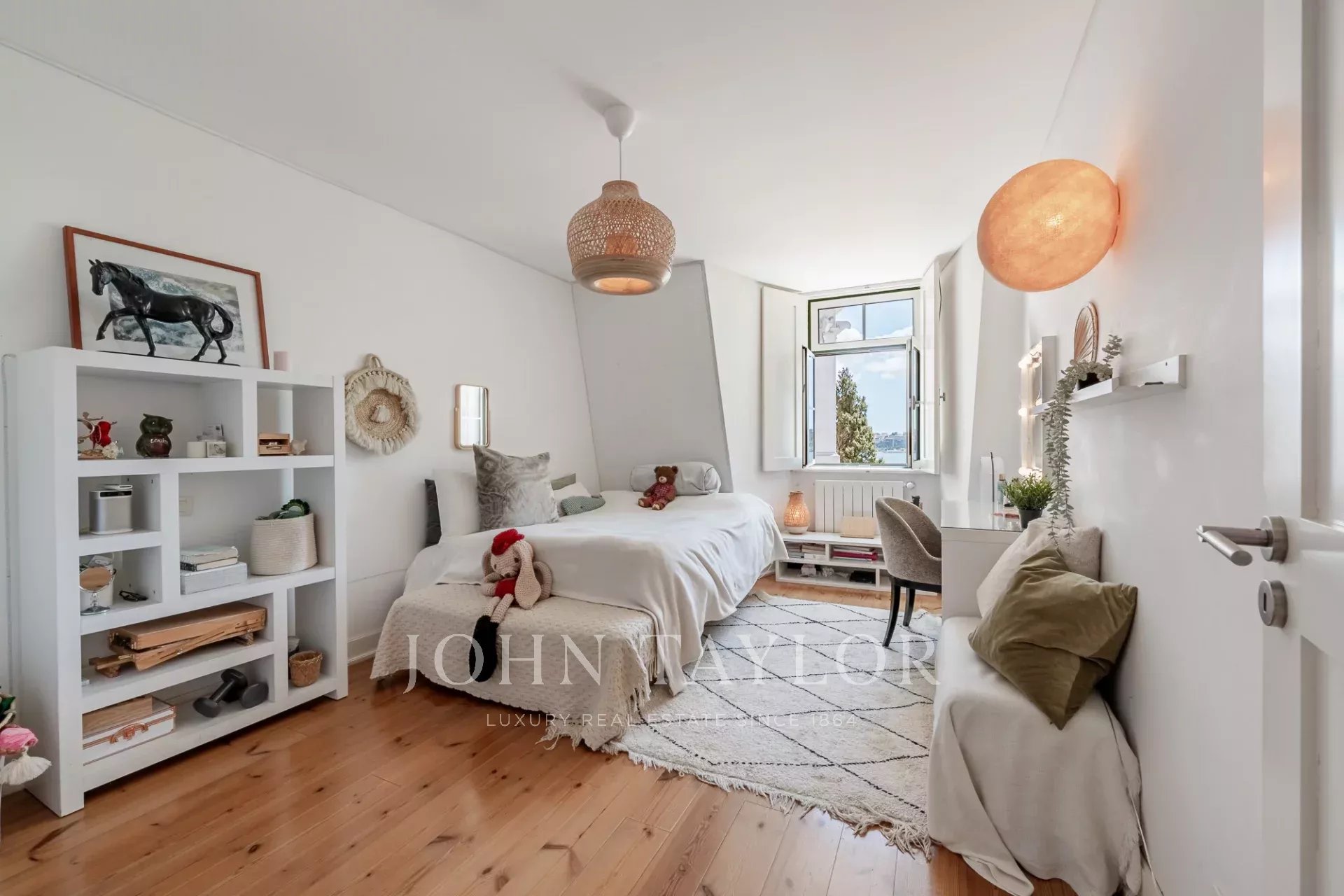 Distribuído por dois andares amplos, este elegante duplex com quatro quartos está idealmente situado no procurado bairro de Santos, em Lisboa. Com vistas ininterruptas sobre o Rio Tejo e o icónico Museu Nacional de Arte Antiga, a propriedade combina o charme arquitetónico intemporal com o conforto moderno.