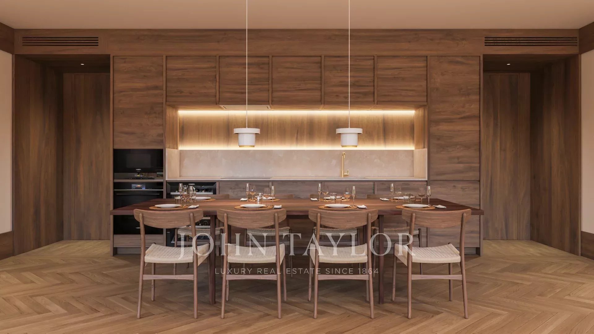 Com uma área bruta de 147 m², o apartamento dispõe no piso térreo de uma ampla sala de estar e jantar, cozinha totalmente equipada, cozinha de apoio, casa de banho social e sala de TV. As zonas de estar abrem-se para um alpendre com área para refeições ao ar livre e uma zona de estar, além de um jardim privado.