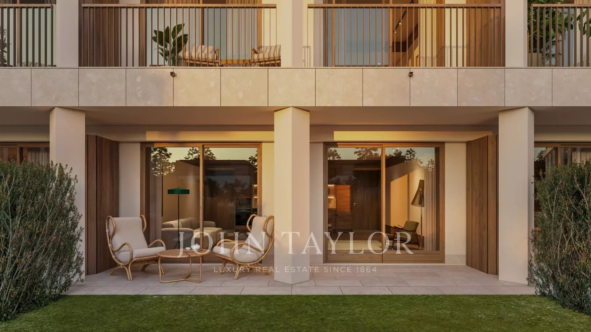 Com uma área bruta de 147 m², o apartamento dispõe no piso térreo de uma ampla sala de estar e jantar, cozinha totalmente equipada, cozinha de apoio, casa de banho social e sala de TV. As zonas de estar abrem-se para um alpendre com área para refeições ao ar livre e uma zona de estar, além de um jardim privado.