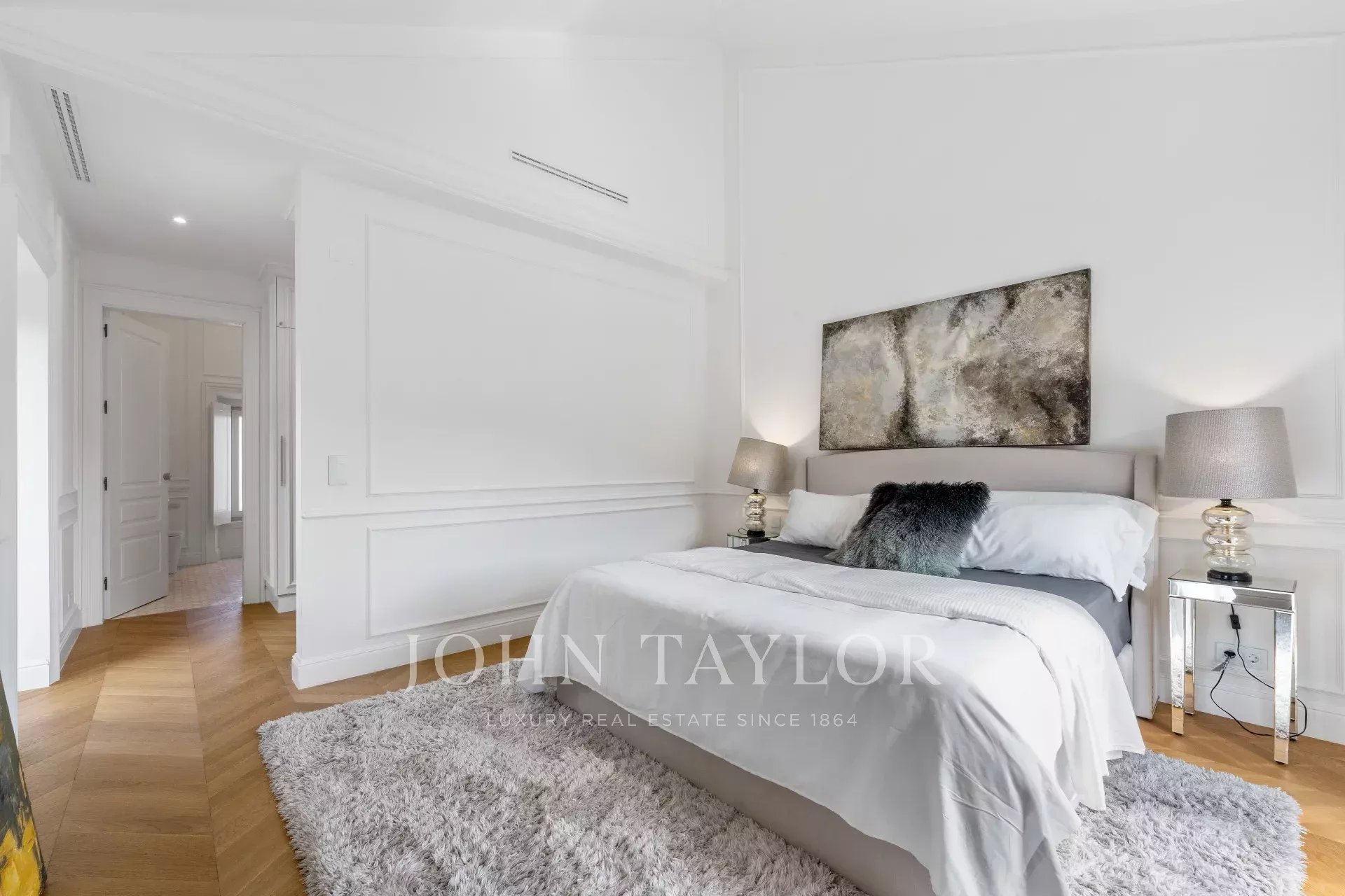 O primeiro andar conta com duas amplas suites, ambas com pé-direito alto e casas de banho elegantes, proporcionando espaços privados confortáveis e luminosos.
