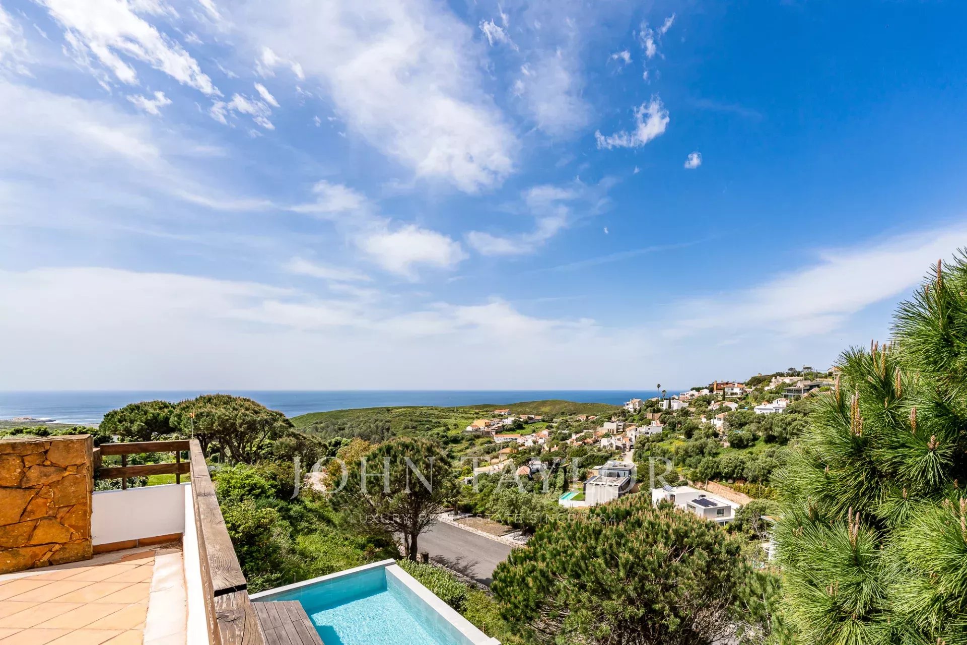 Localizada num condomínio privado seguro perto da Baía do Guincho, esta moradia oferece vistas ininterruptas sobre o Oceano Atlântico a partir de várias divisões e espaços exteriores. Destaca-se pela sua posição elevada e perspetiva aberta, com o mar visível a partir das áreas de estar, terraço e piscina privada.