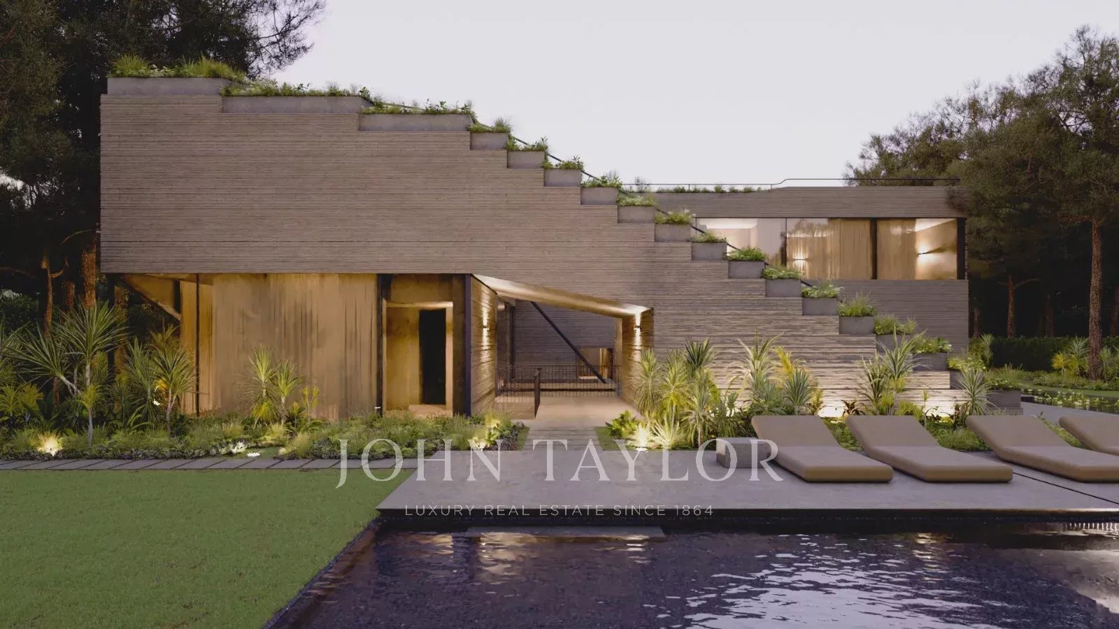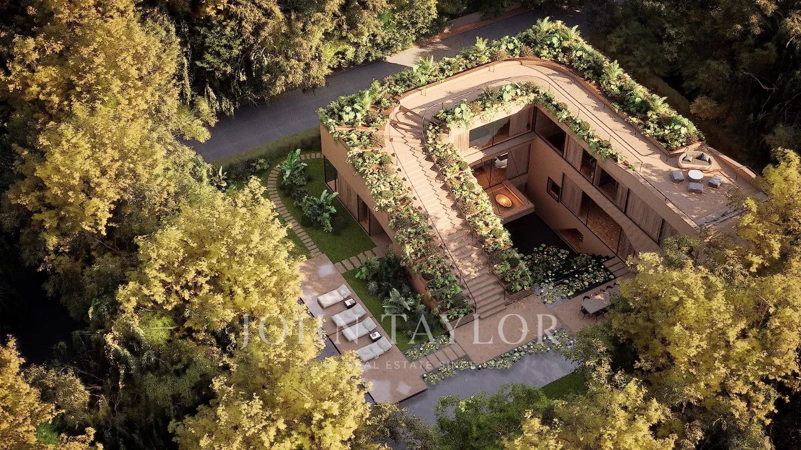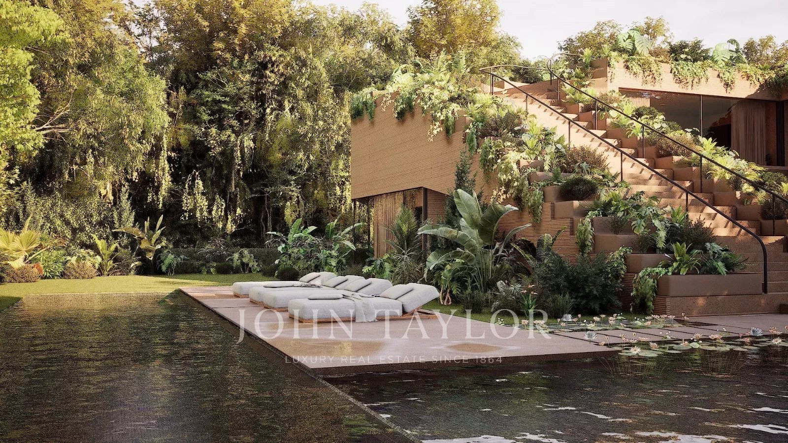 O exterior da "Infinite House" é um verdadeiro oásis, com um jardim paisagístico que envolve a piscina e um terraço panorâmico no topo, proporcionando vistas incríveis sobre a envolvente natural.