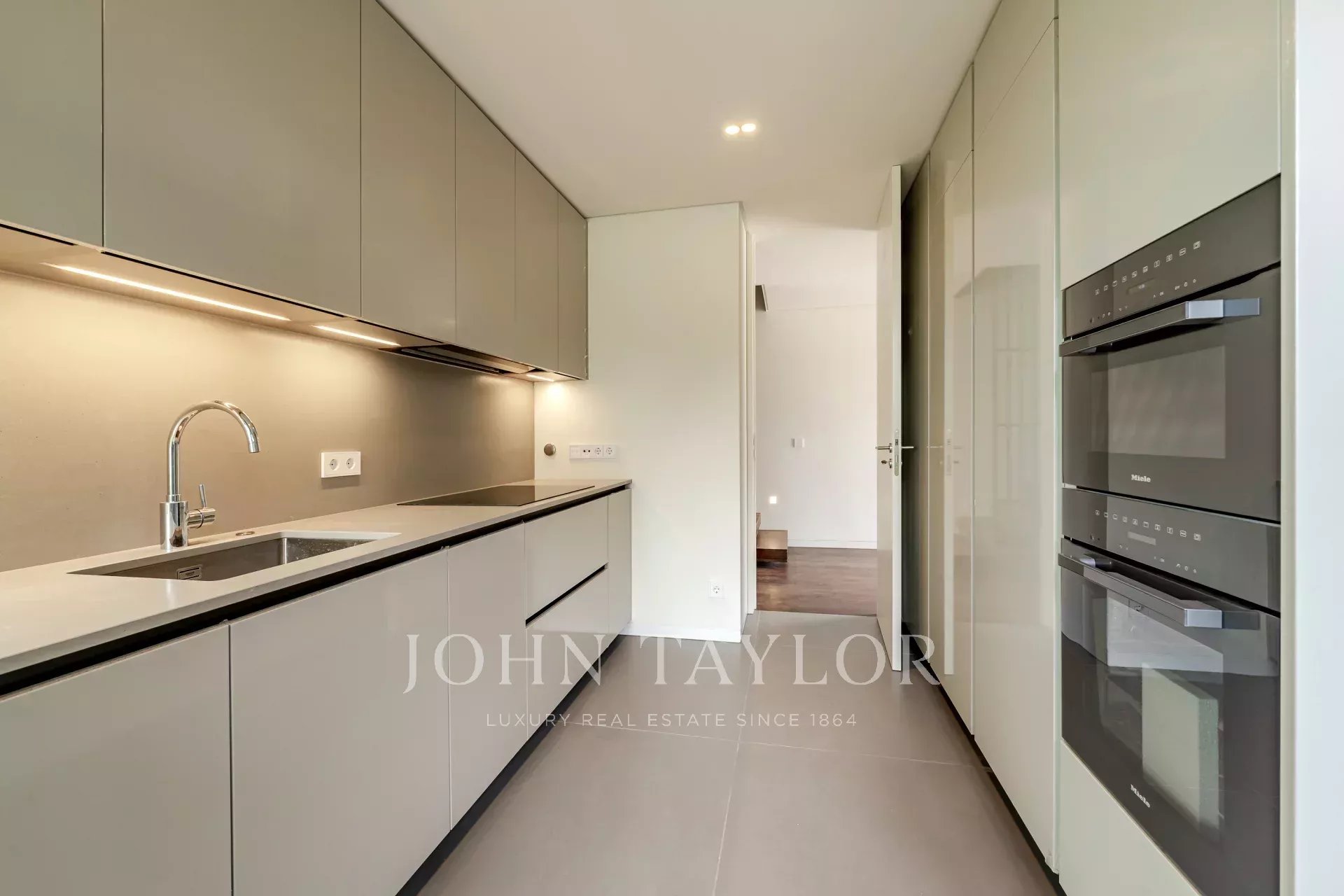 O rés do chão é composto por uma luminosa sala de estar e jantar, com 48 m² e ligação direta ao deck e jardim, proporcionando uma vivência fluida entre interior e exterior. A cozinha está totalmente equipada, e este piso inclui ainda uma lavandaria com acesso a um pátio de serviço e uma casa de banho social. A moradia dispõe de três lugares de estacionamento privativo.