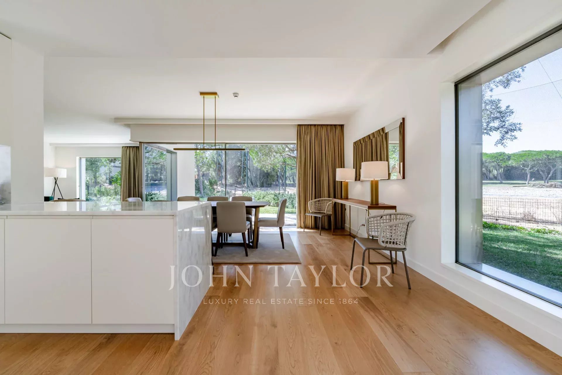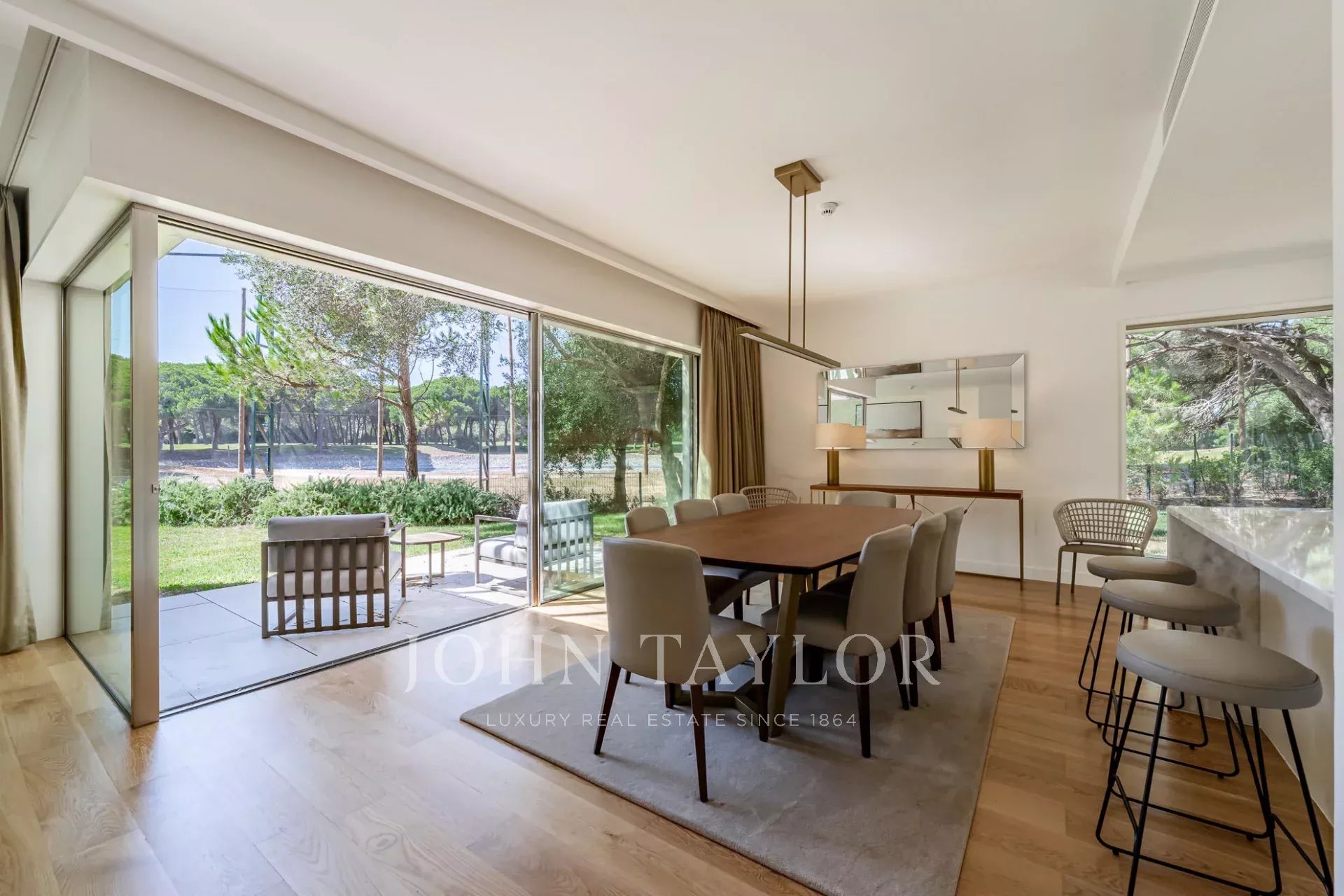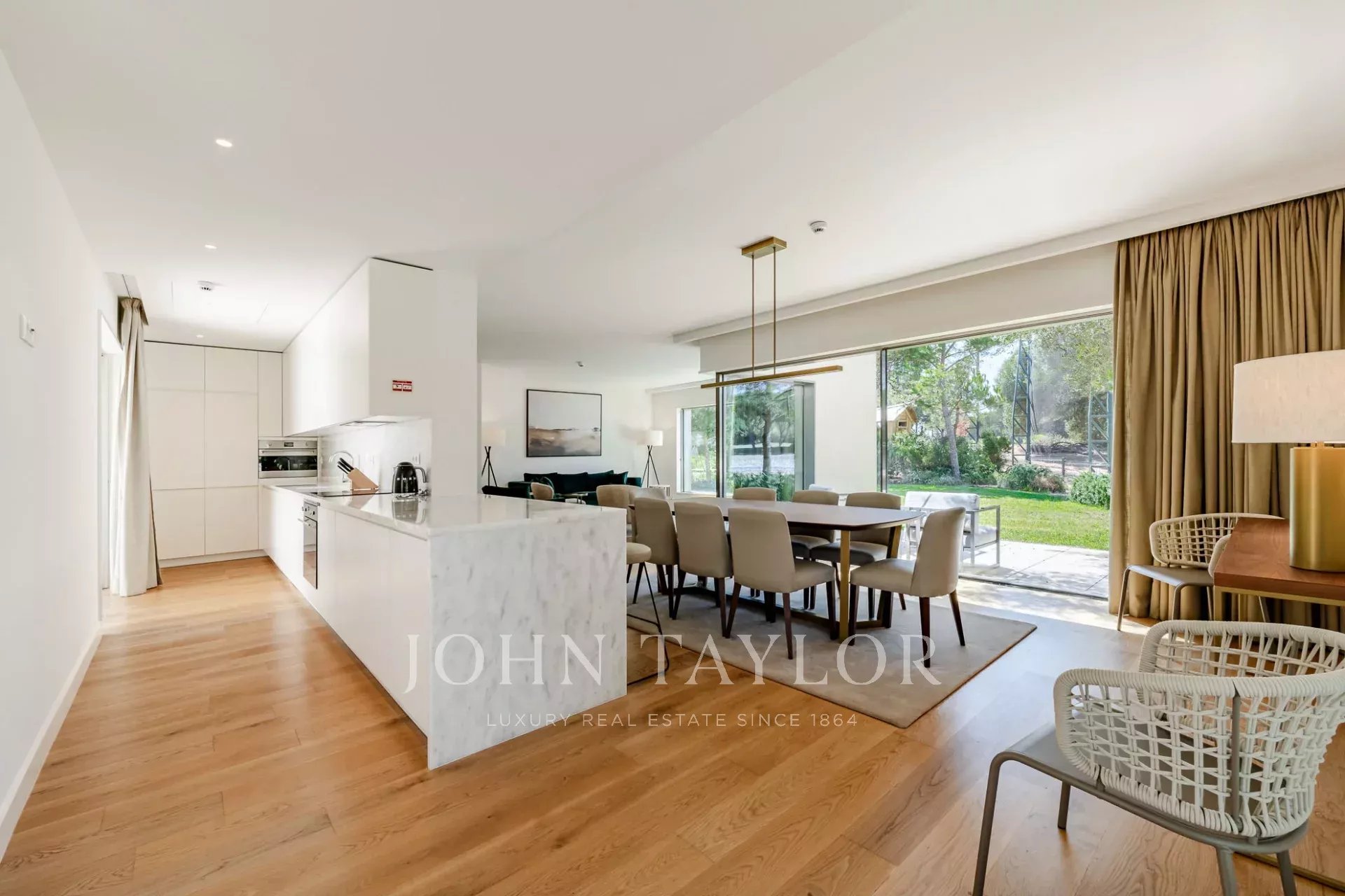 O piso térreo apresenta uma espaçosa sala de estar e jantar que se abre diretamente para o jardim através de grandes portas de vidro, criando um fluxo perfeito entre a vida interior e exterior. Uma cozinha totalmente equipada, uma casa de banho para hóspedes e dois confortáveis quartos em suite completam este piso.