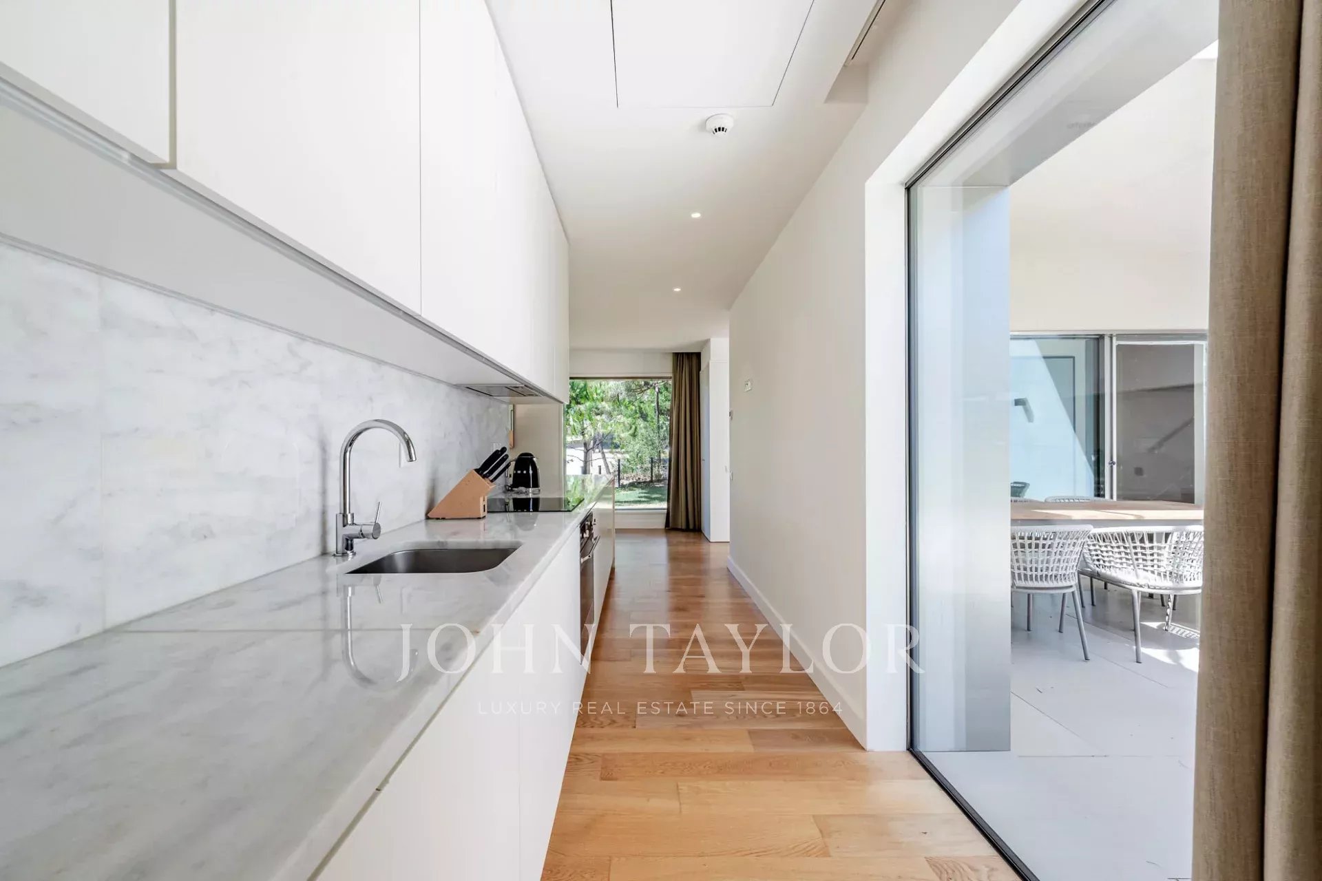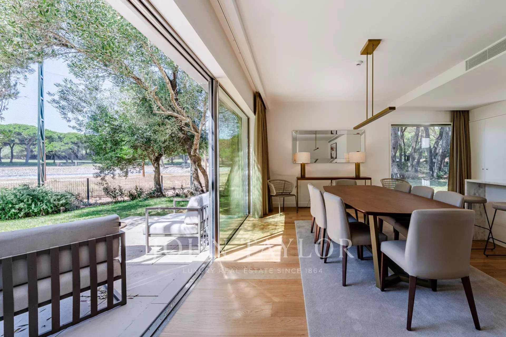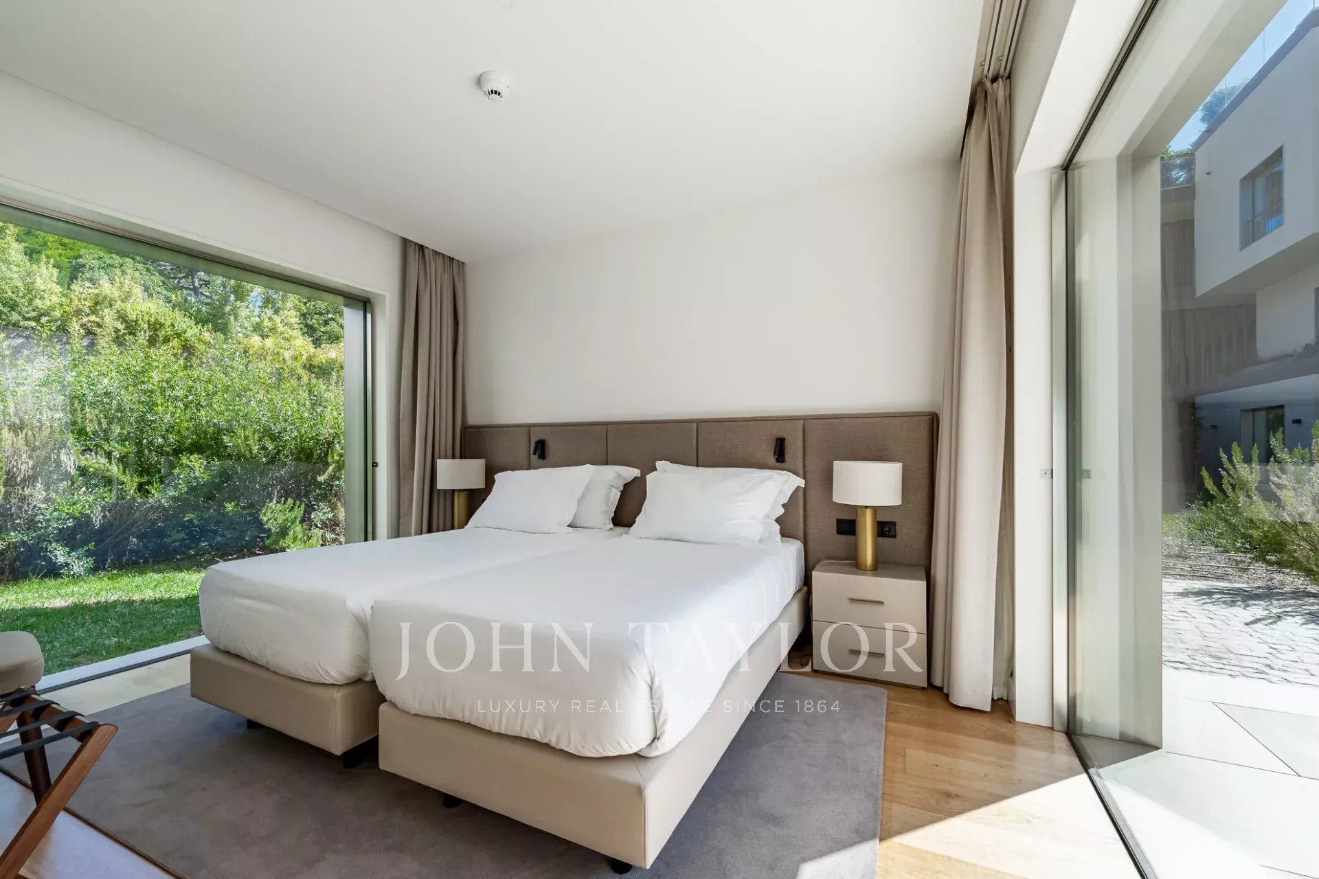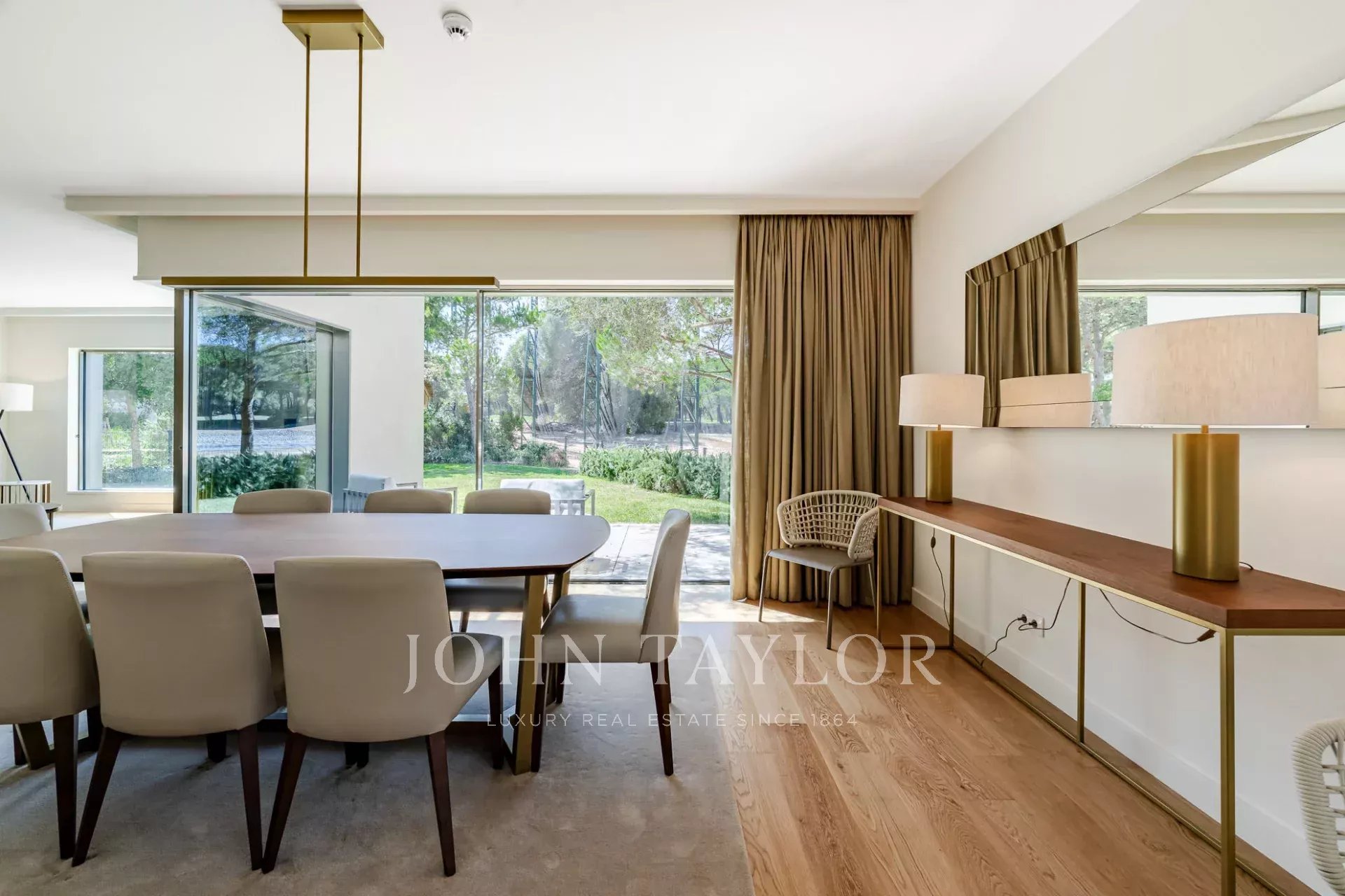O piso térreo apresenta uma espaçosa sala de estar e jantar que se abre diretamente para o jardim através de grandes portas de vidro, criando um fluxo perfeito entre a vida interior e exterior. Uma cozinha totalmente equipada, uma casa de banho para hóspedes e dois confortáveis quartos em suite completam este piso.
