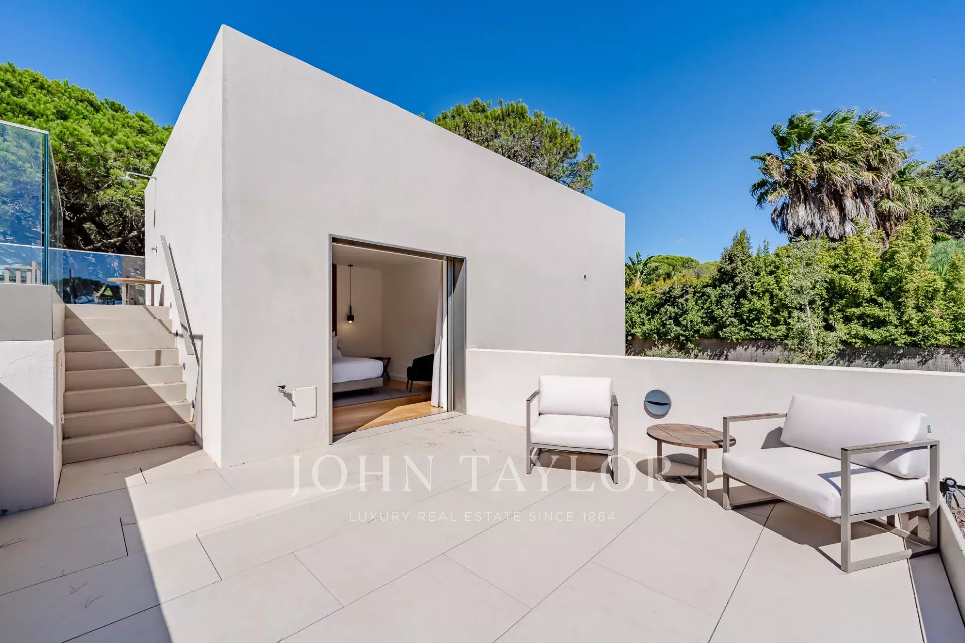 No piso superior, a suite principal tem uma varanda privada e acesso direto ao terraço onde se encontra a piscina