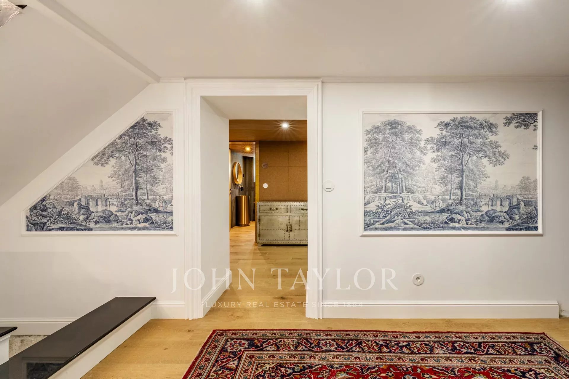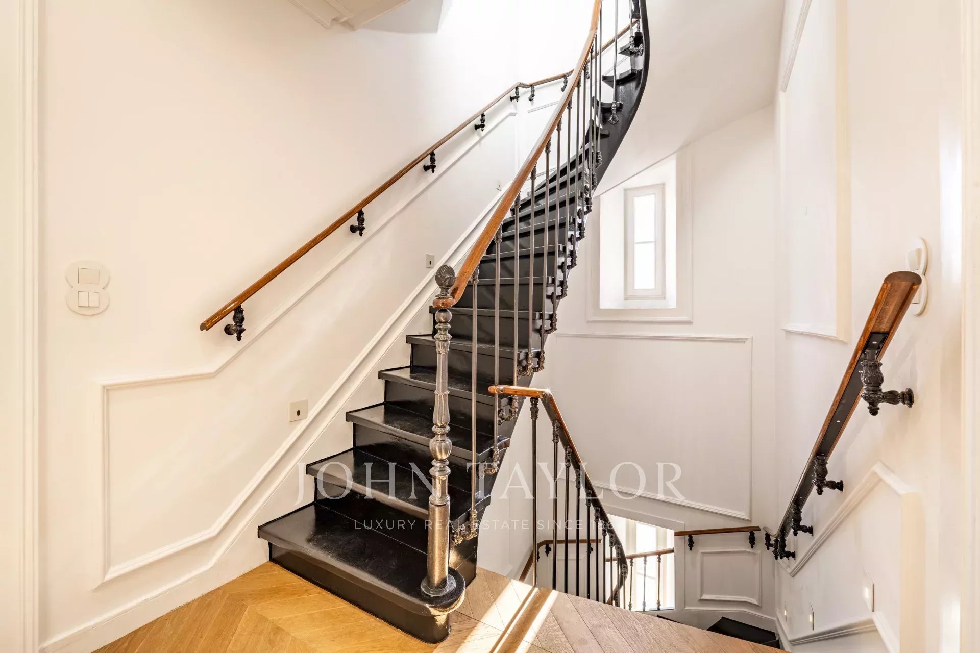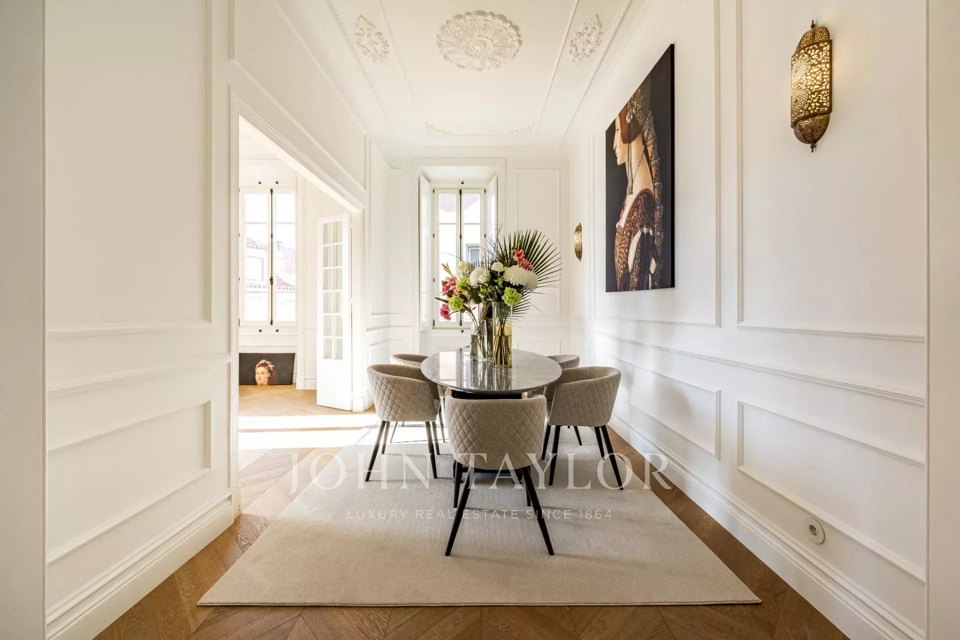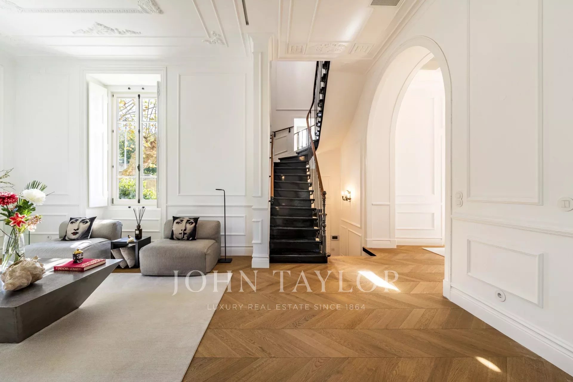 Distribuída por quatro pisos, o rés-do-chão conta com uma ampla sala de estar que se abre diretamente para um jardim paisagístico, criando uma perfeita continuidade entre os espaços interiores e exteriores. A sala de jantar, de cariz formal, e a cozinha totalmente equipada são ideais para momentos de convívio, seja em ambiente mais descontraído ou mais sofisticado.
