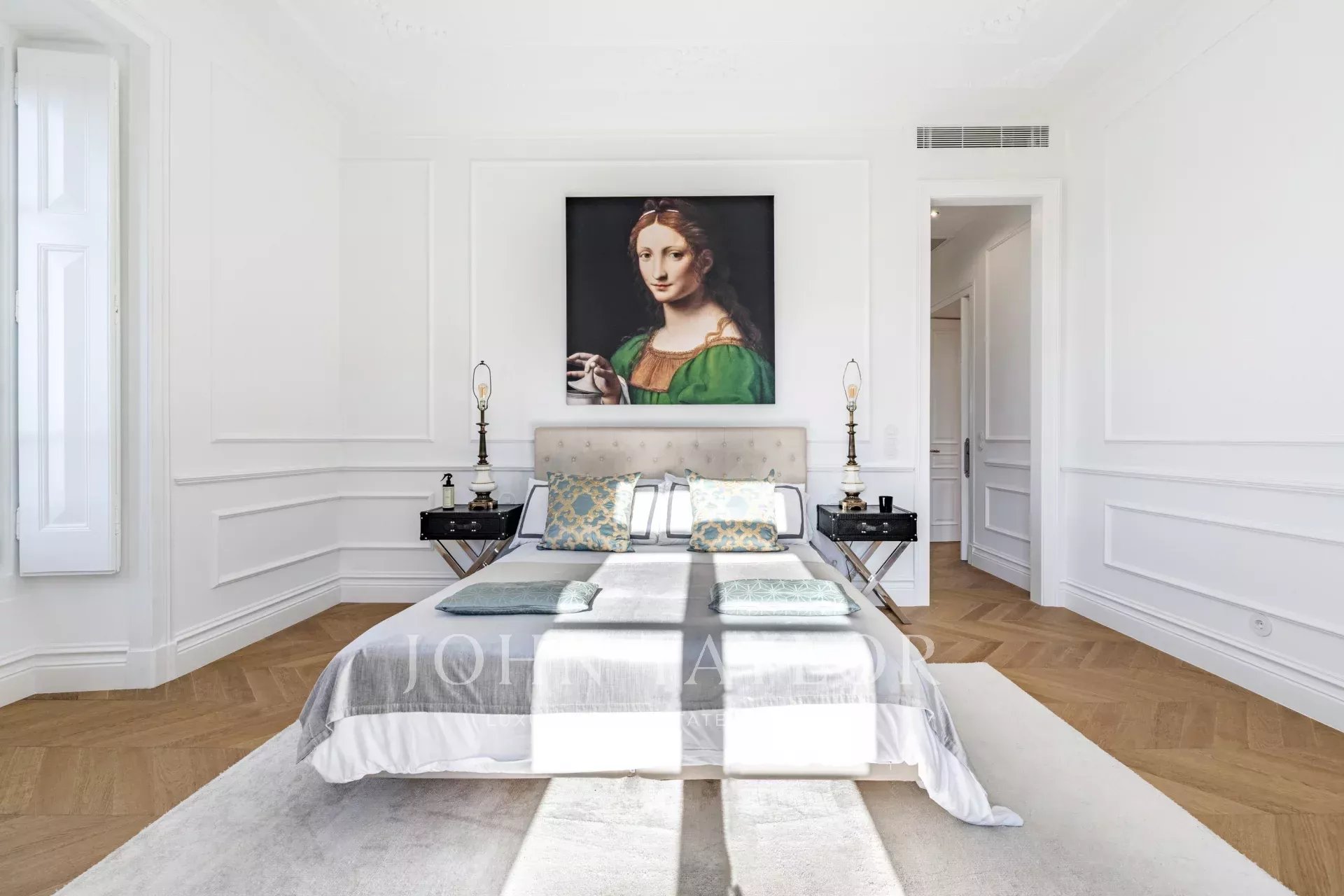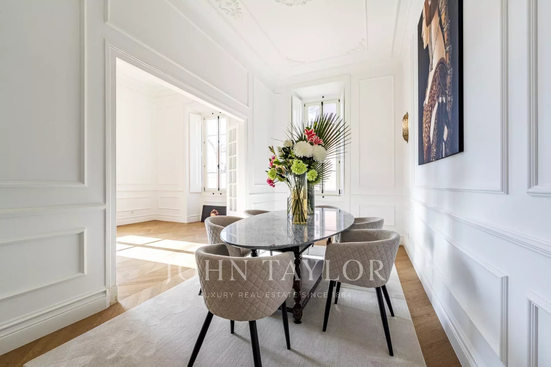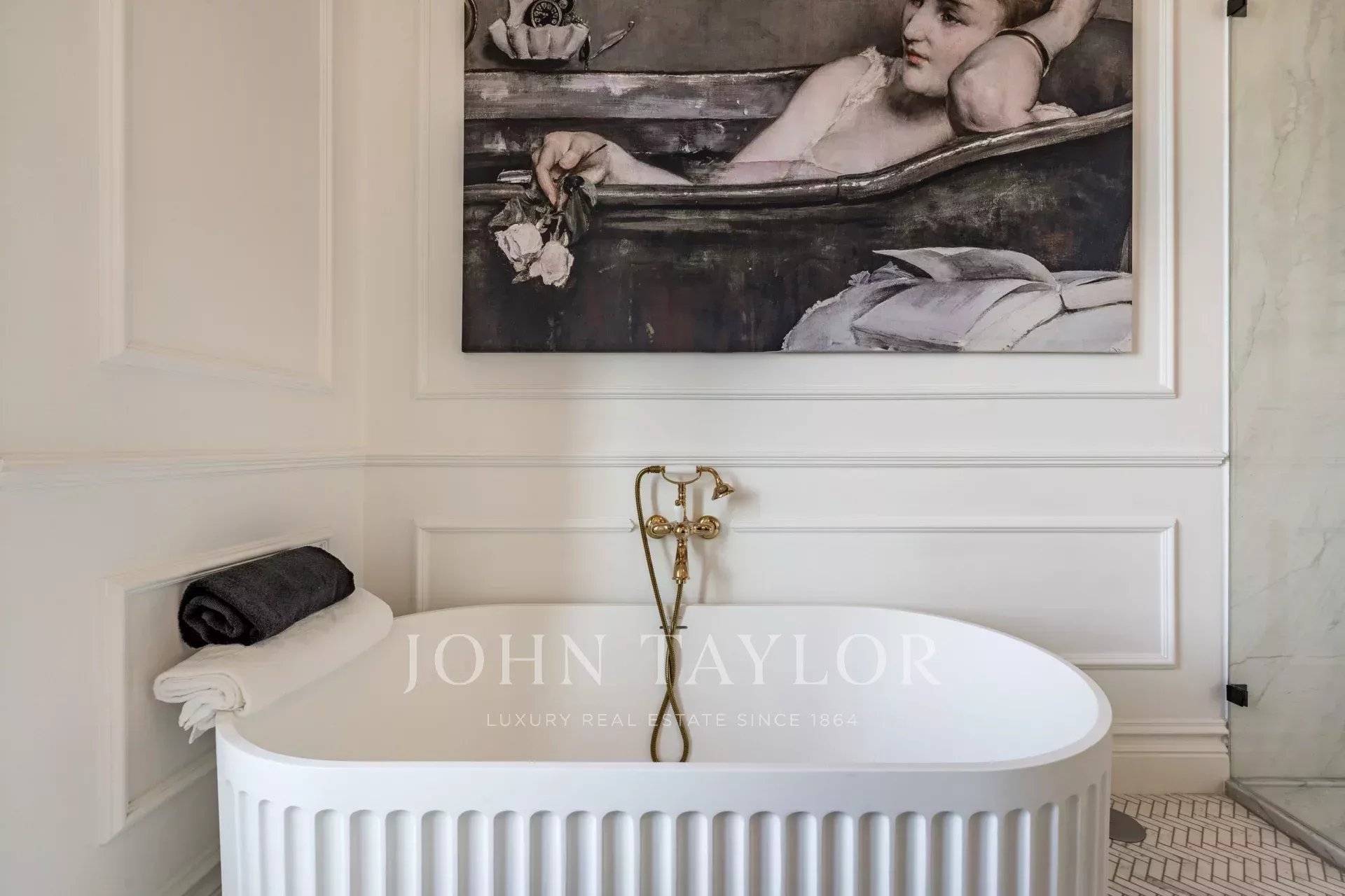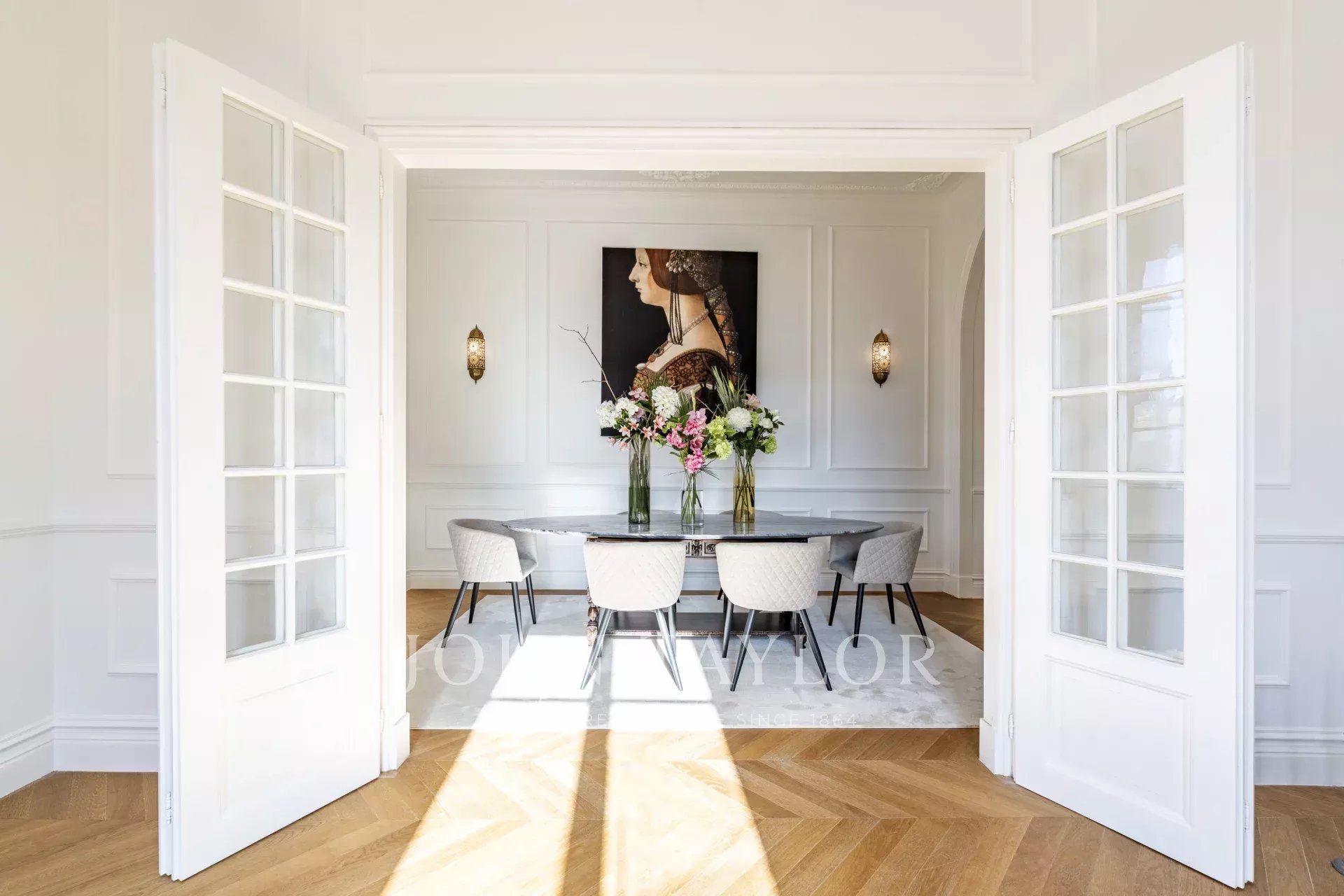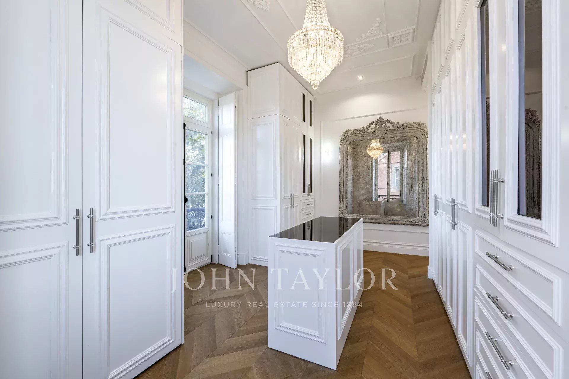 Distribuída por quatro pisos, o rés-do-chão conta com uma ampla sala de estar que se abre diretamente para um jardim paisagístico, criando uma perfeita continuidade entre os espaços interiores e exteriores. A sala de jantar, de cariz formal, e a cozinha totalmente equipada são ideais para momentos de convívio, seja em ambiente mais descontraído ou mais sofisticado.