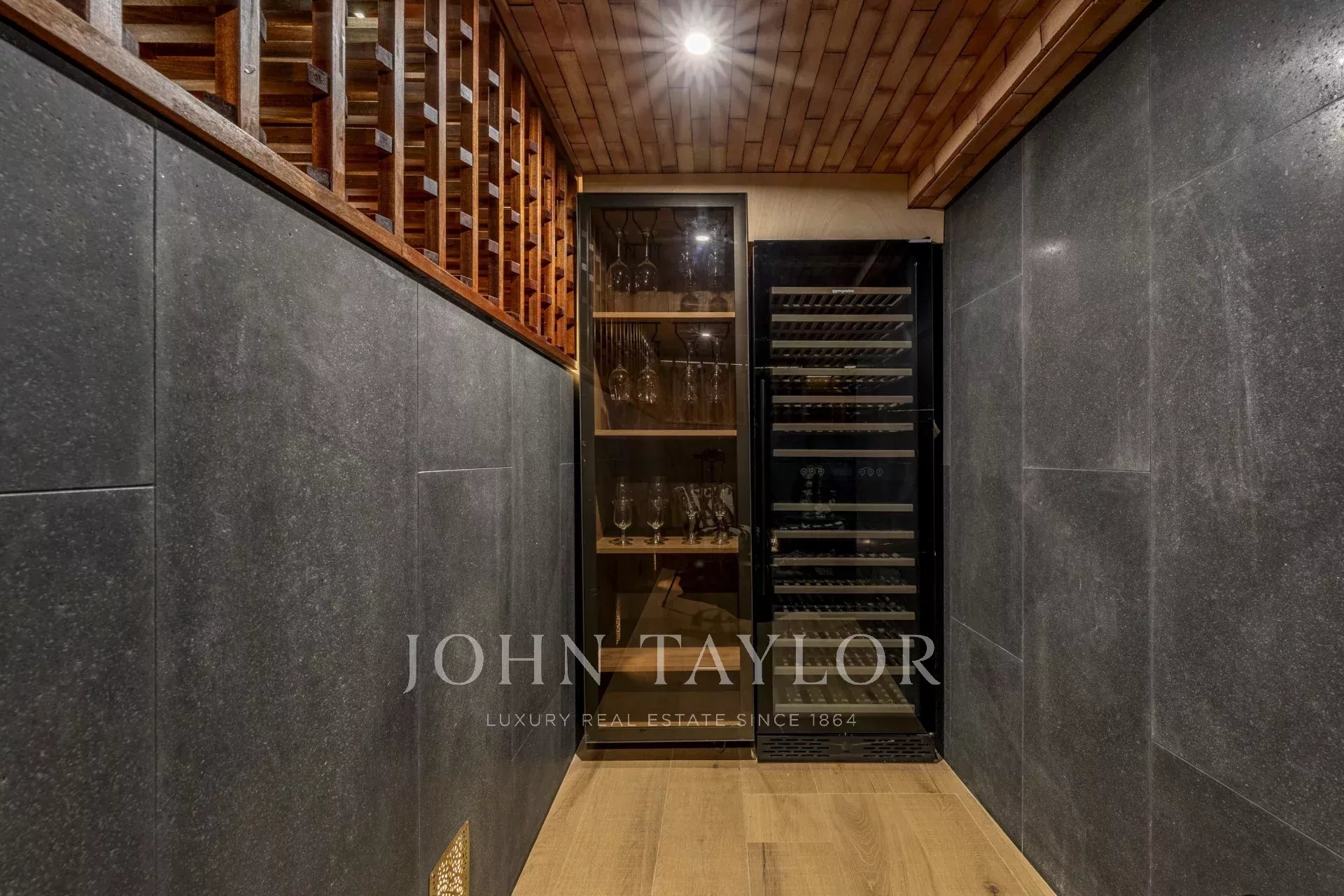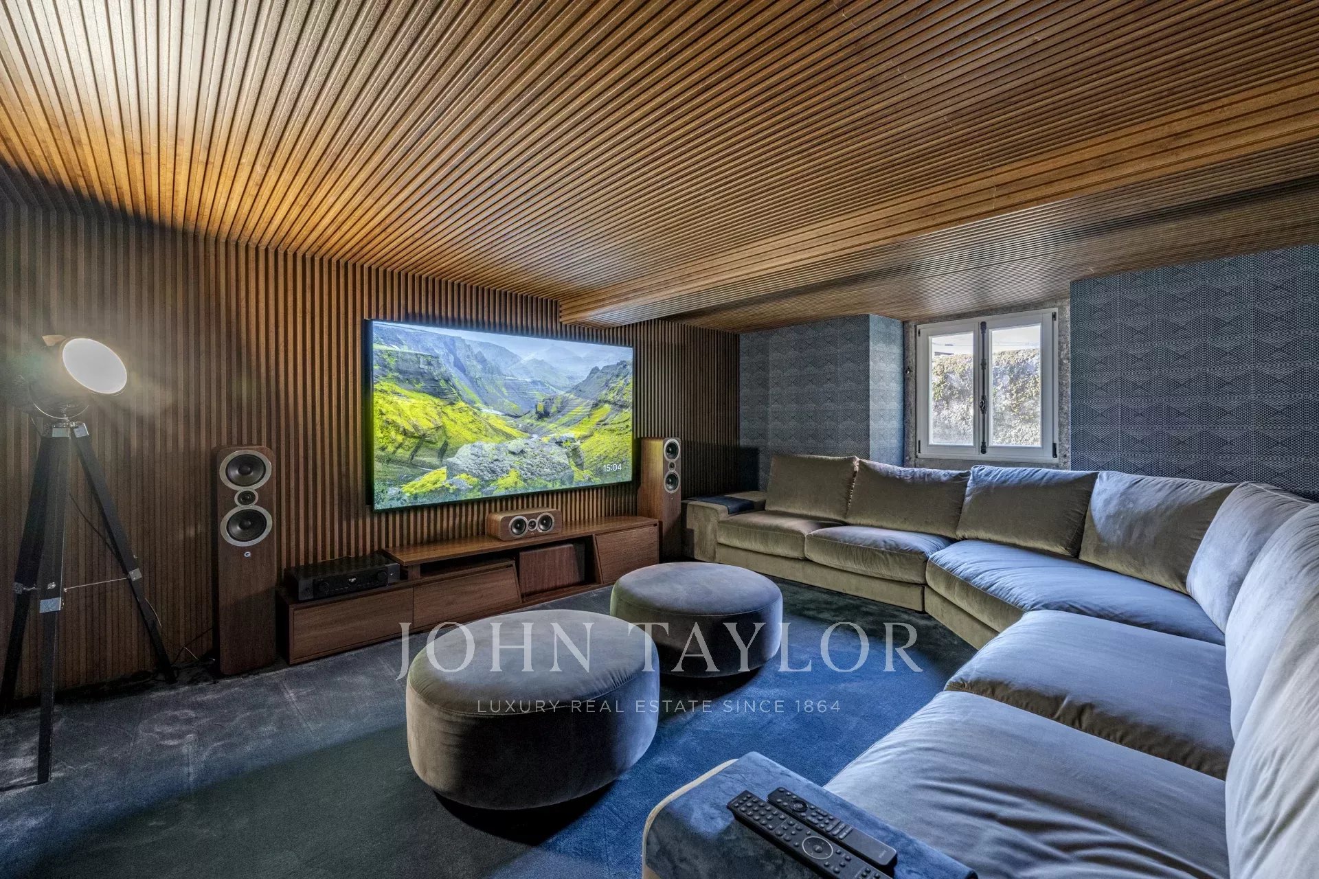 O piso inferior dedica-se ao lazer, com uma sala de televisão insonorizada, uma adega, sauna, lavandaria e um quarto adicional.