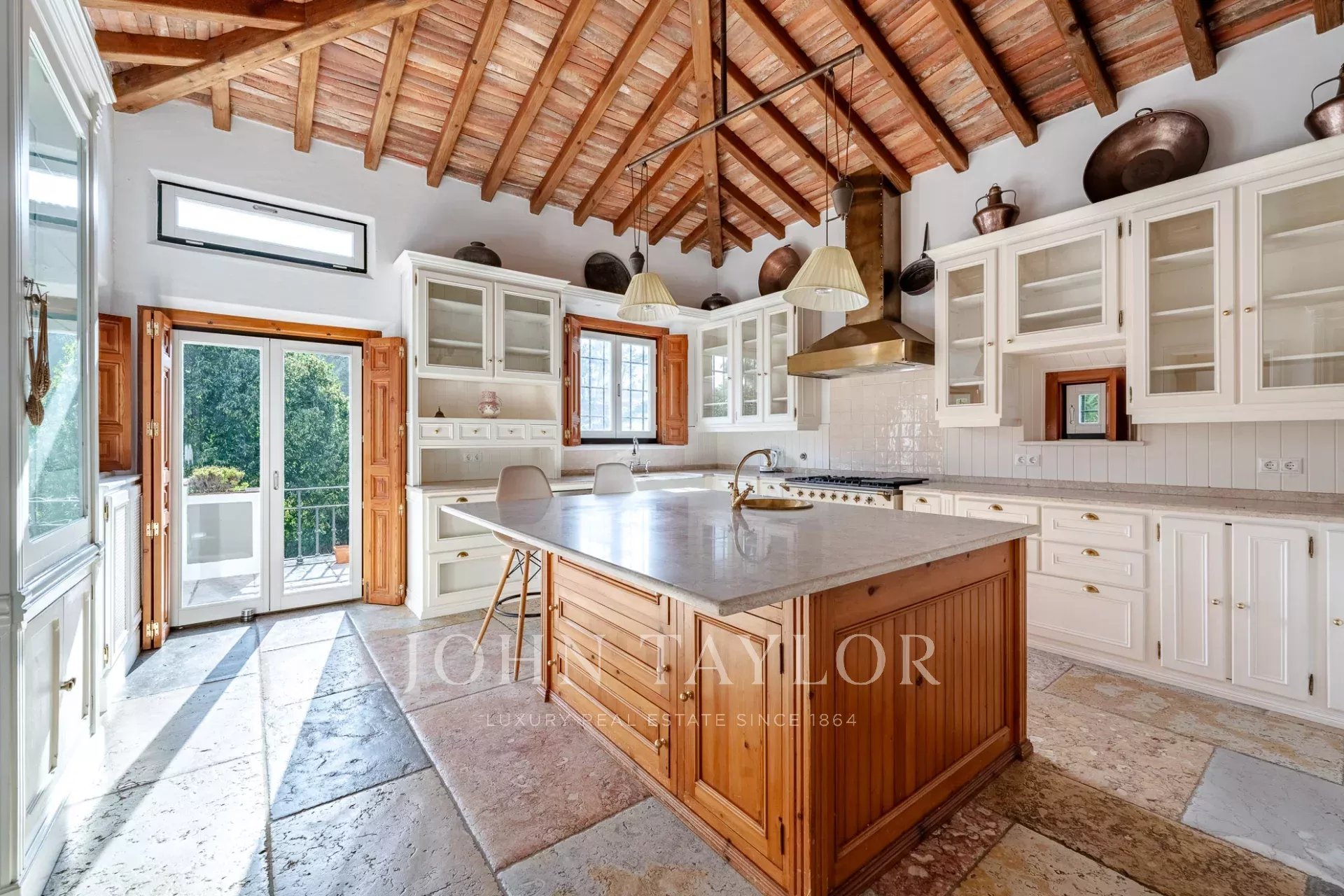 * Cozinha de 23 m², com ilha em mármore, fogão e forno a gás, e acesso direto aos terraços exteriores — perfeita para refeições ao ar livre.