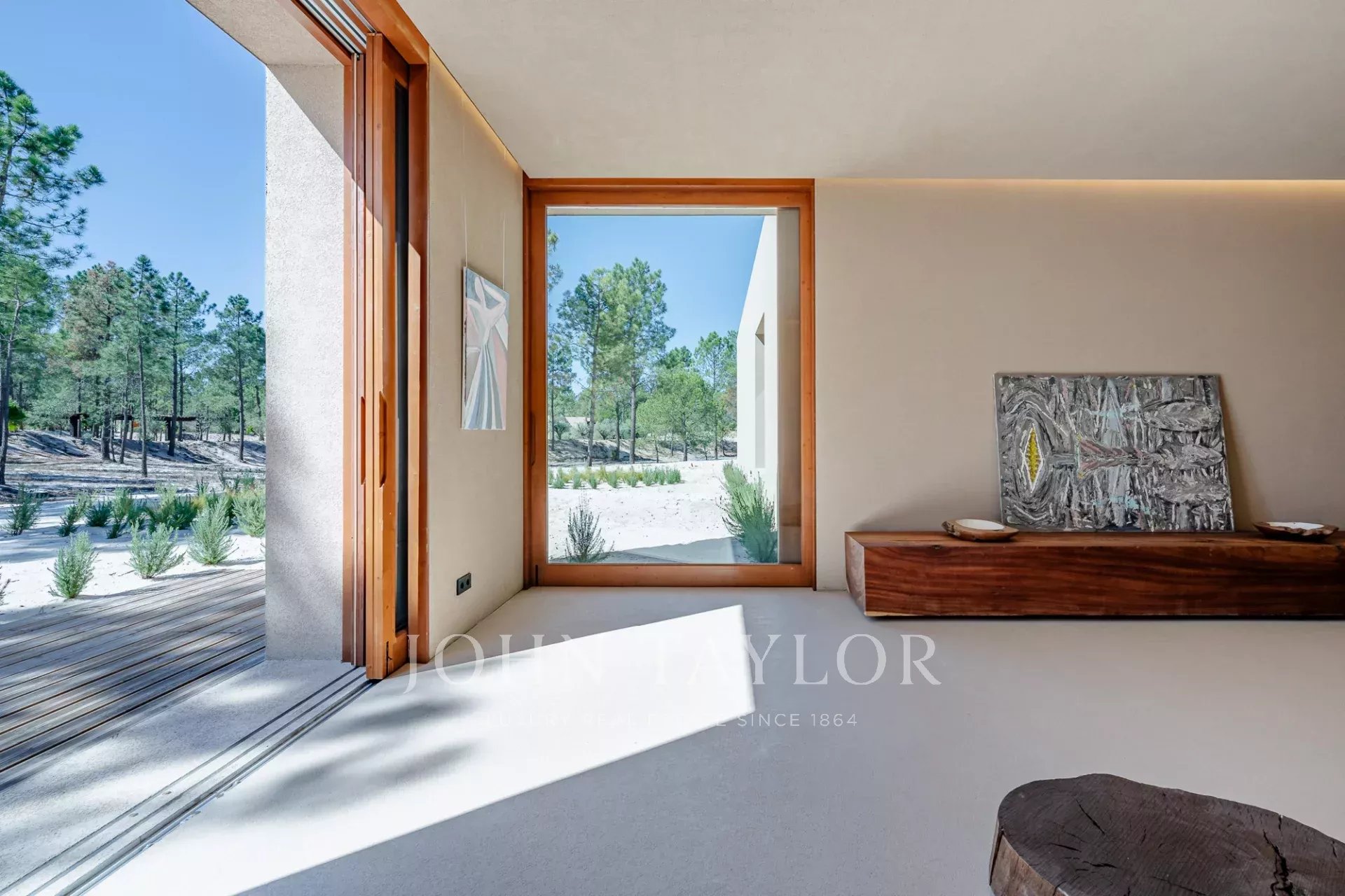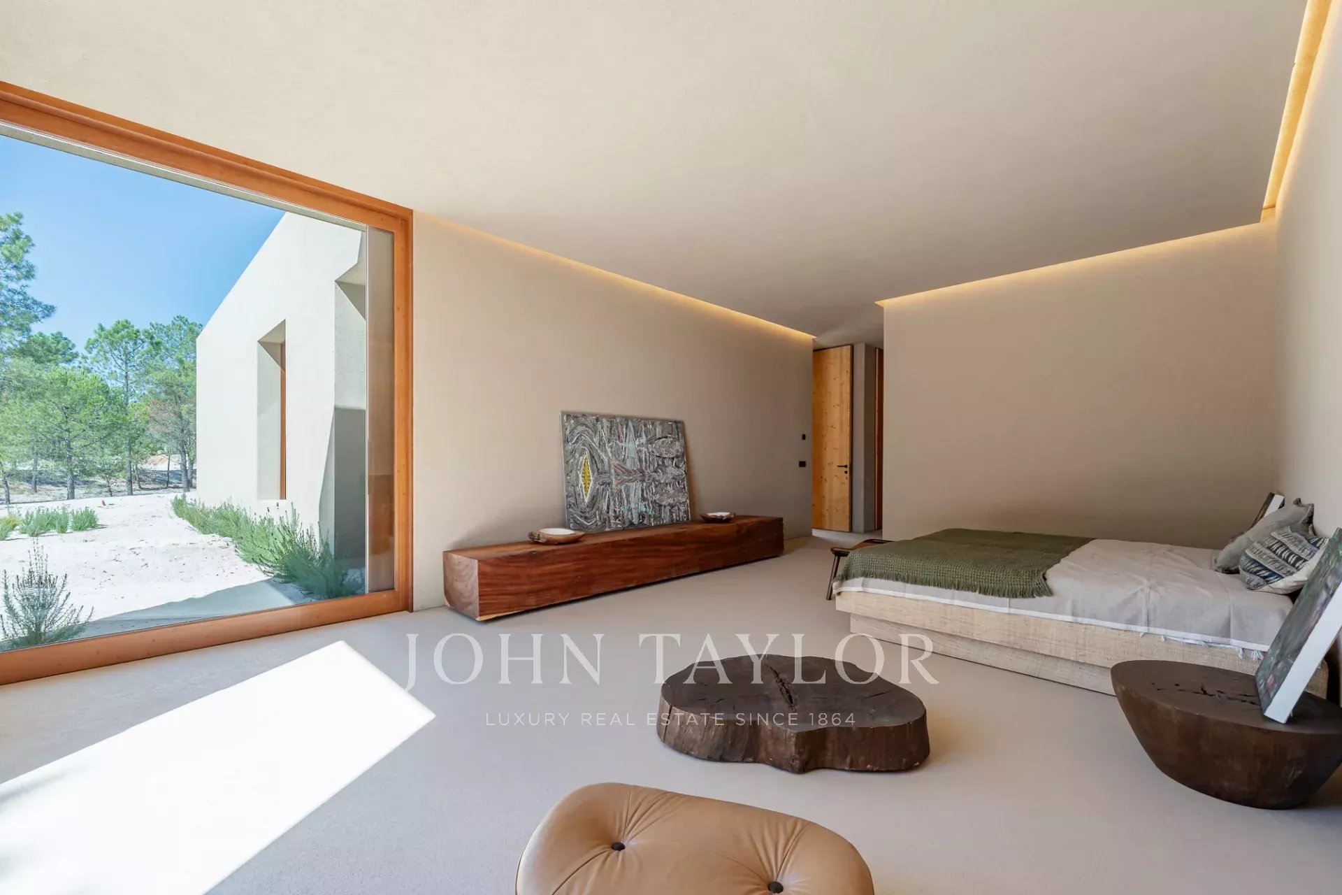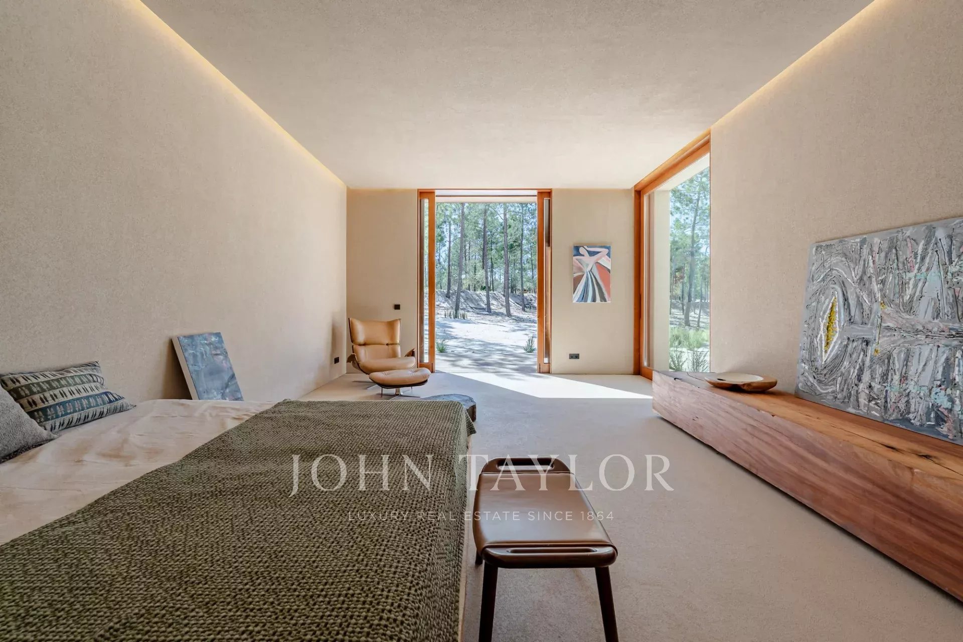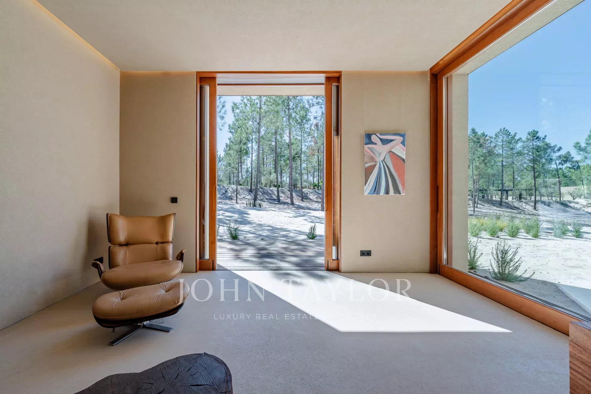 A propriedade possui quatro quartos espaçosos em suite, cada um com o seu próprio deck de madeira privado, e duas salas de estar com vistas deslumbrantes. Uma com vista para a piscina de 96 m2 e a outra para os tranquilos pinhais e para a beleza natural da Comporta. O design da moradia abraça a vida interior e exterior, com uma cozinha grande e totalmente equipada, despensa e ampla arrumação.