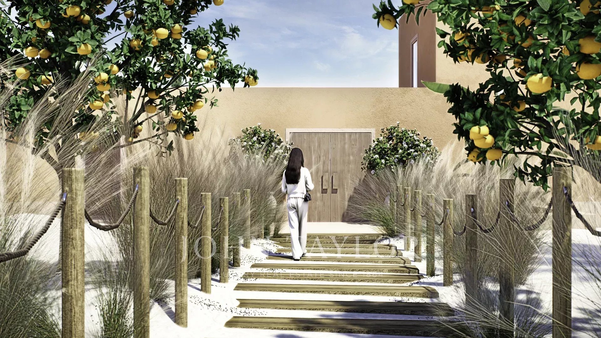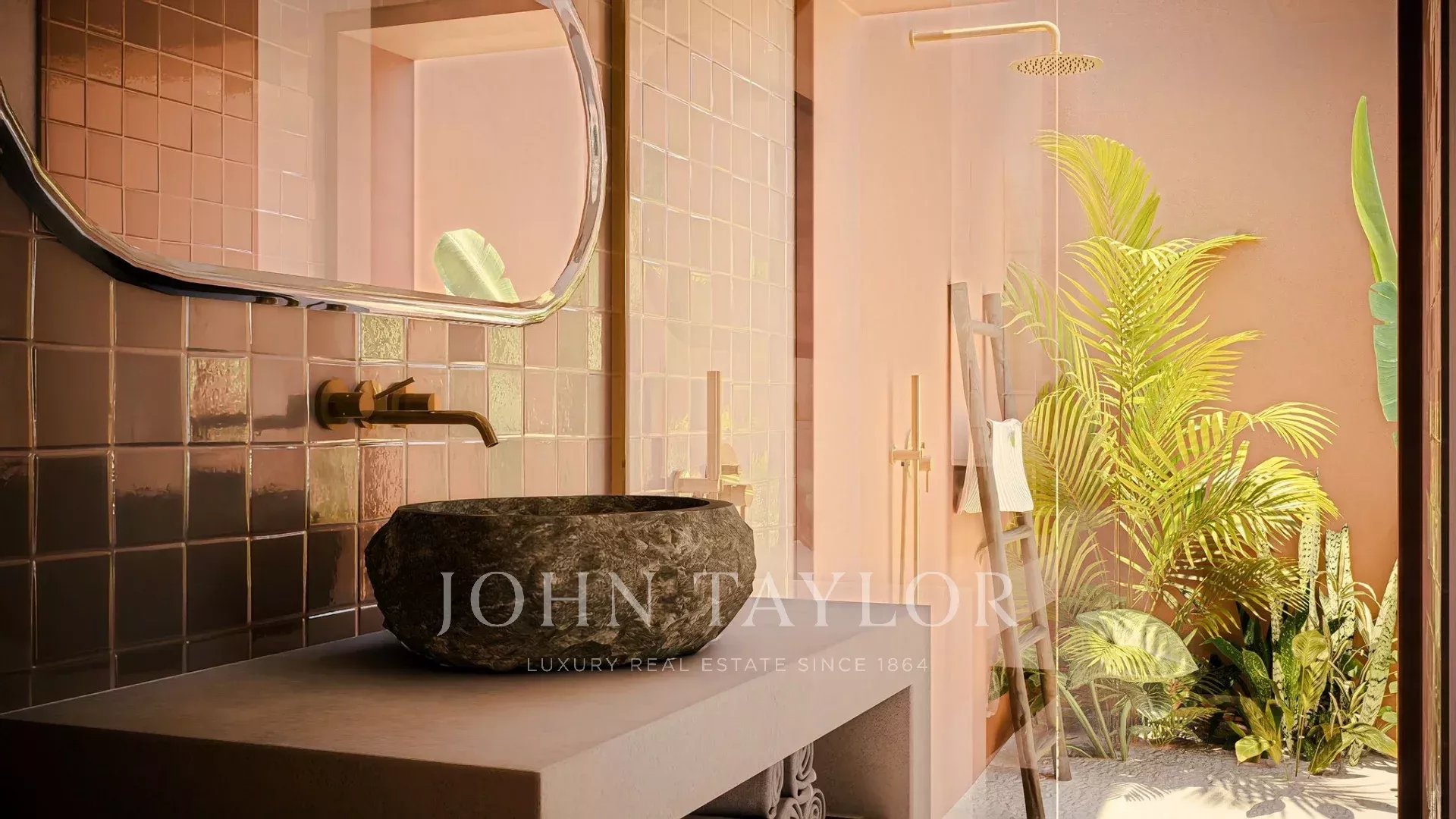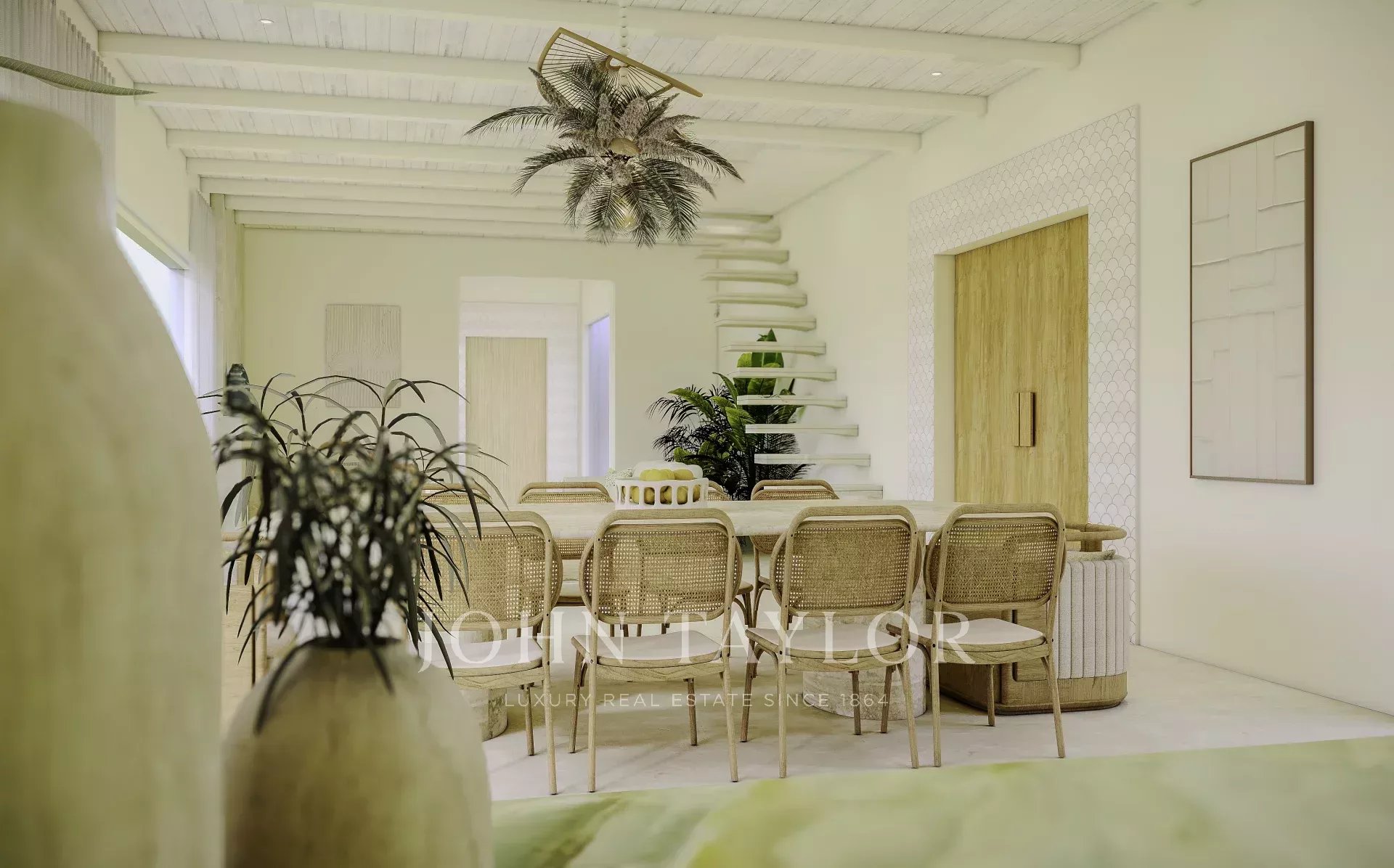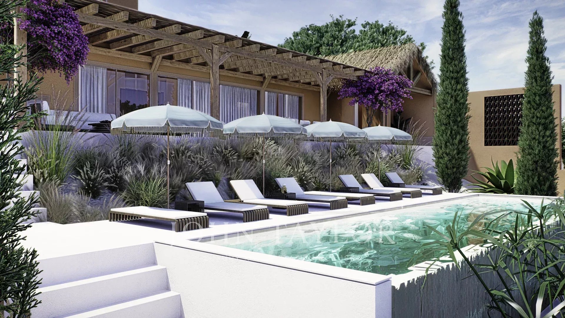 Com um projeto de arquitetura contemporânea, o imóvel é composto por uma moradia principal e duas cabanas independentes para hóspedes. A moradia principal dispõe de três suites, uma cozinha em open space com zona de refeições e sala de estar, três terraços, rooftop e ginásio. Cada cabana inclui uma suite e um terraço privativo. A propriedade é vendida totalmente mobilada e conta ainda com uma adega exterior.