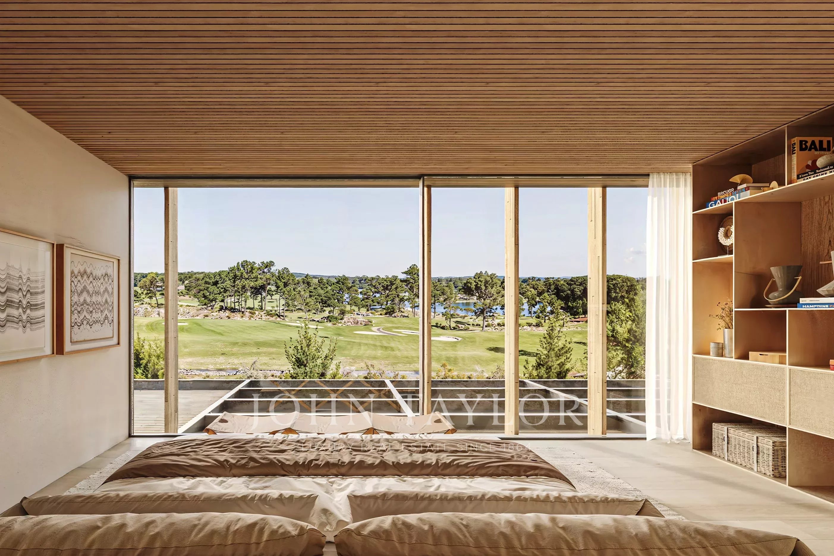 O piso superior inclui a suite principal de 24 m² com uma casa de banho de 17 m², um quarto adicional com 19 m² em suite e acesso à garagem de 47 m². O layout mantém a privacidade enquanto enquadra vistas elevadas sobre os fairways e o pinhal.