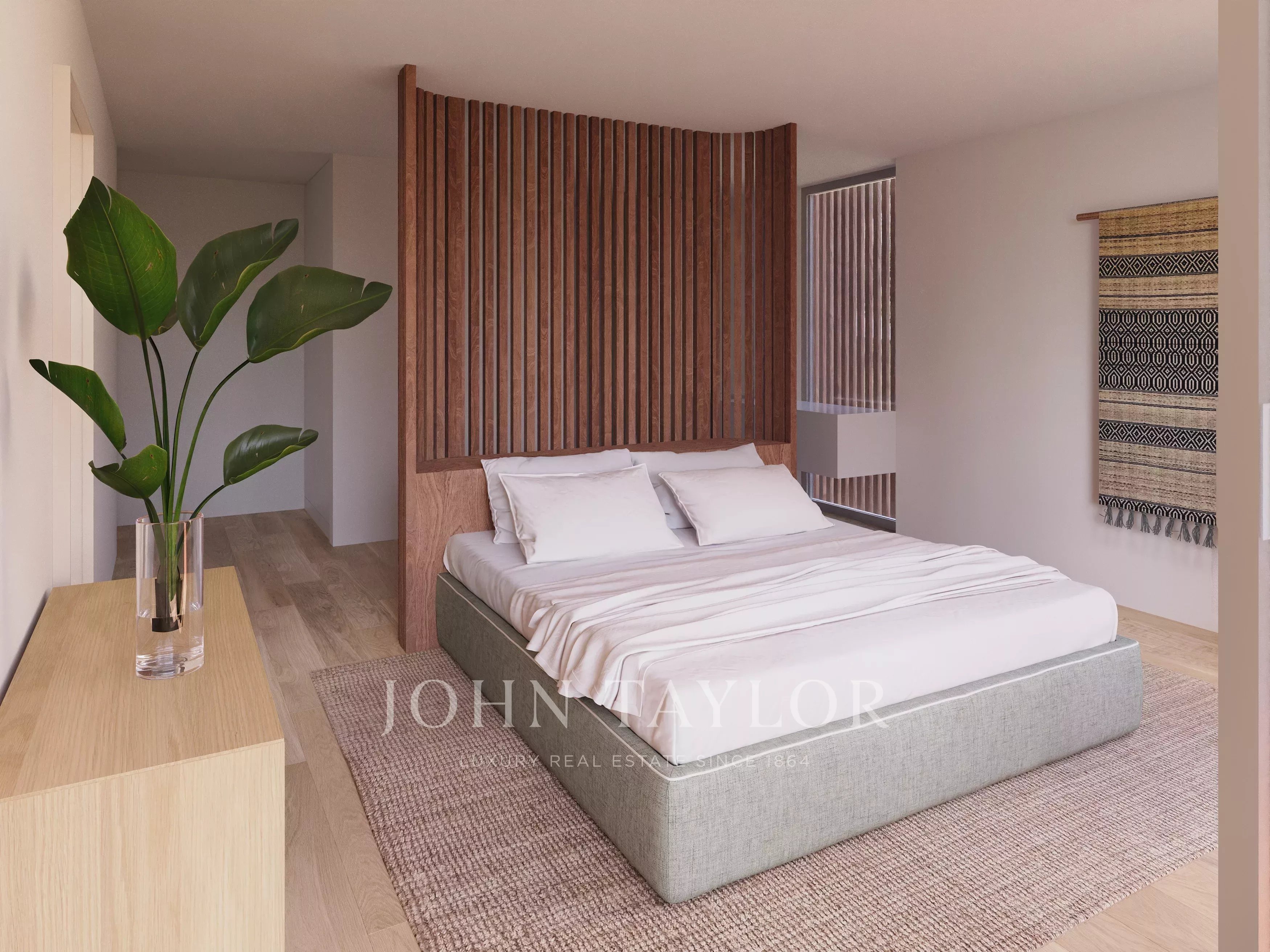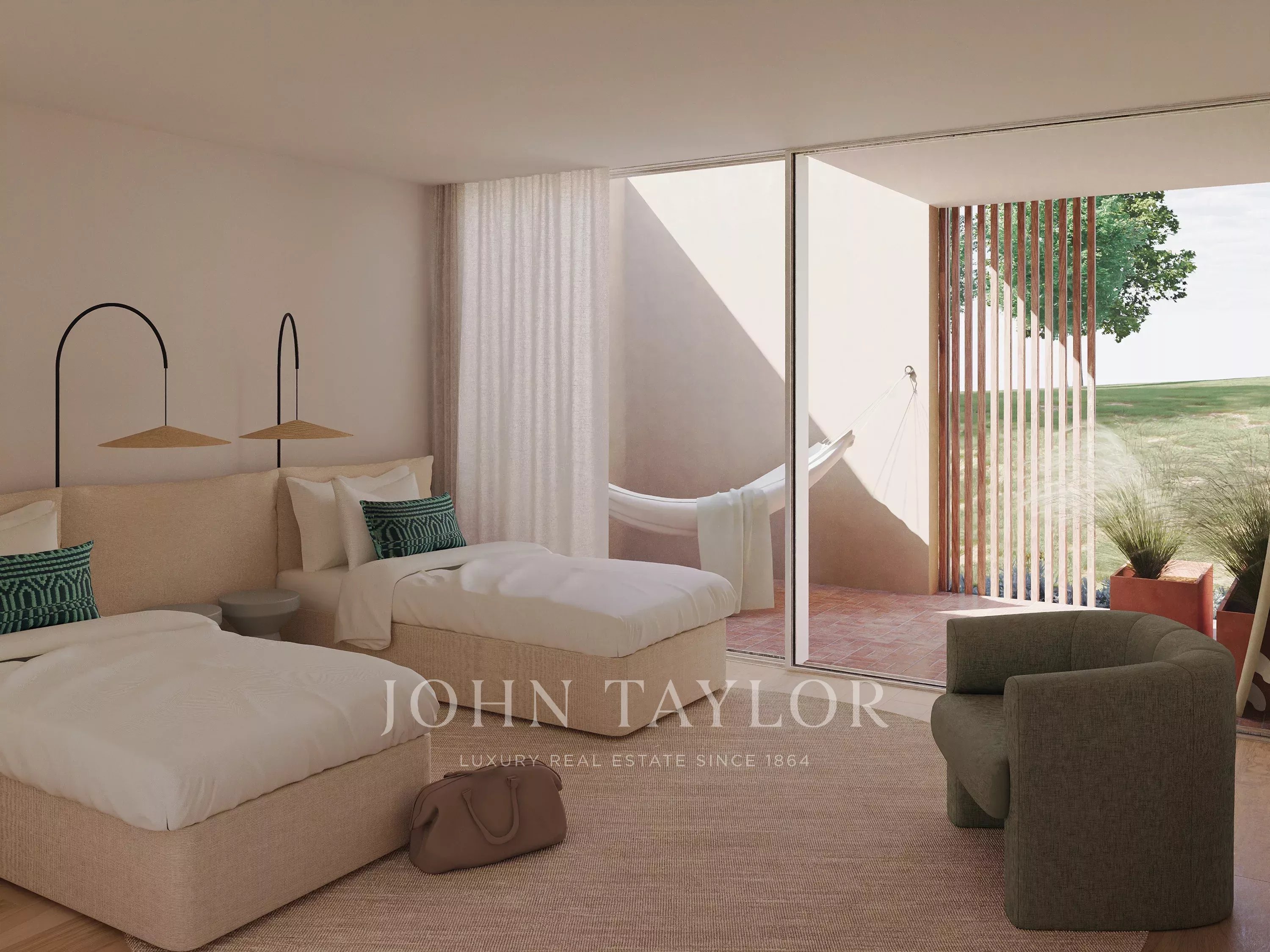 A propriedade inclui três quartos em suite, dois com cerca de 21 m² e uma terceira suite com aproximadamente 18 m². Todos os quartos dispõem de casa de banho privativa e mantêm uma ligação direta aos espaços exteriores, reforçando a relação entre o interior da casa e a envolvente natural.