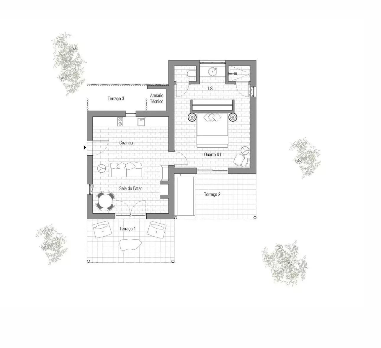 Moradia T1 com 62 m² de área bruta privativa, inserida num lote de 624 m², localizada no empreendimento Independente Comporta.