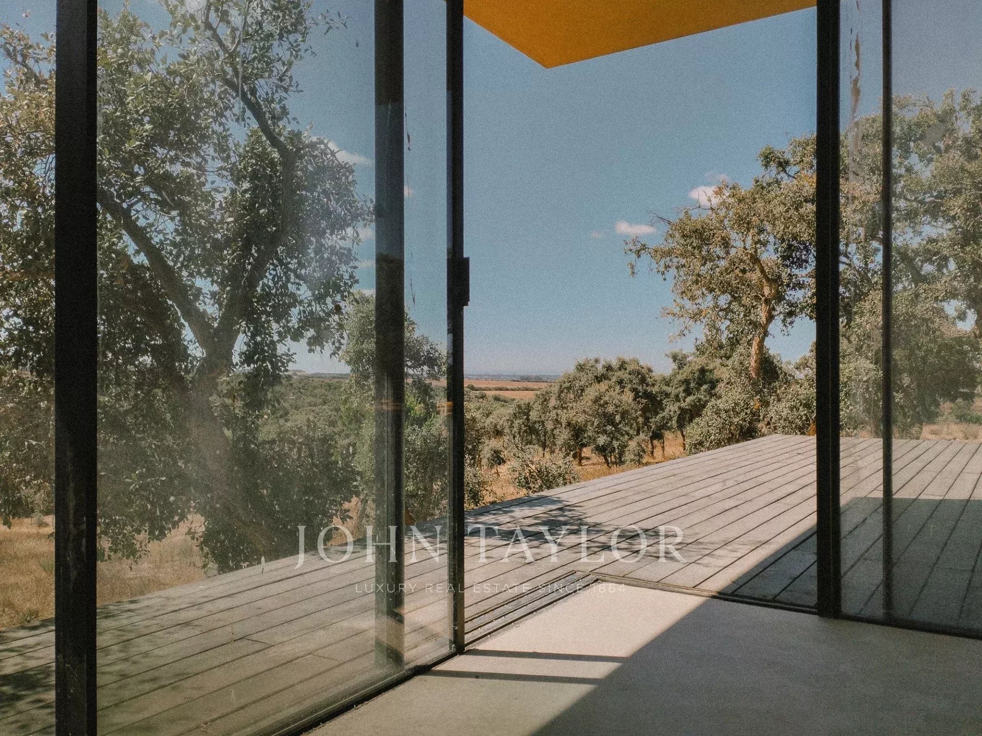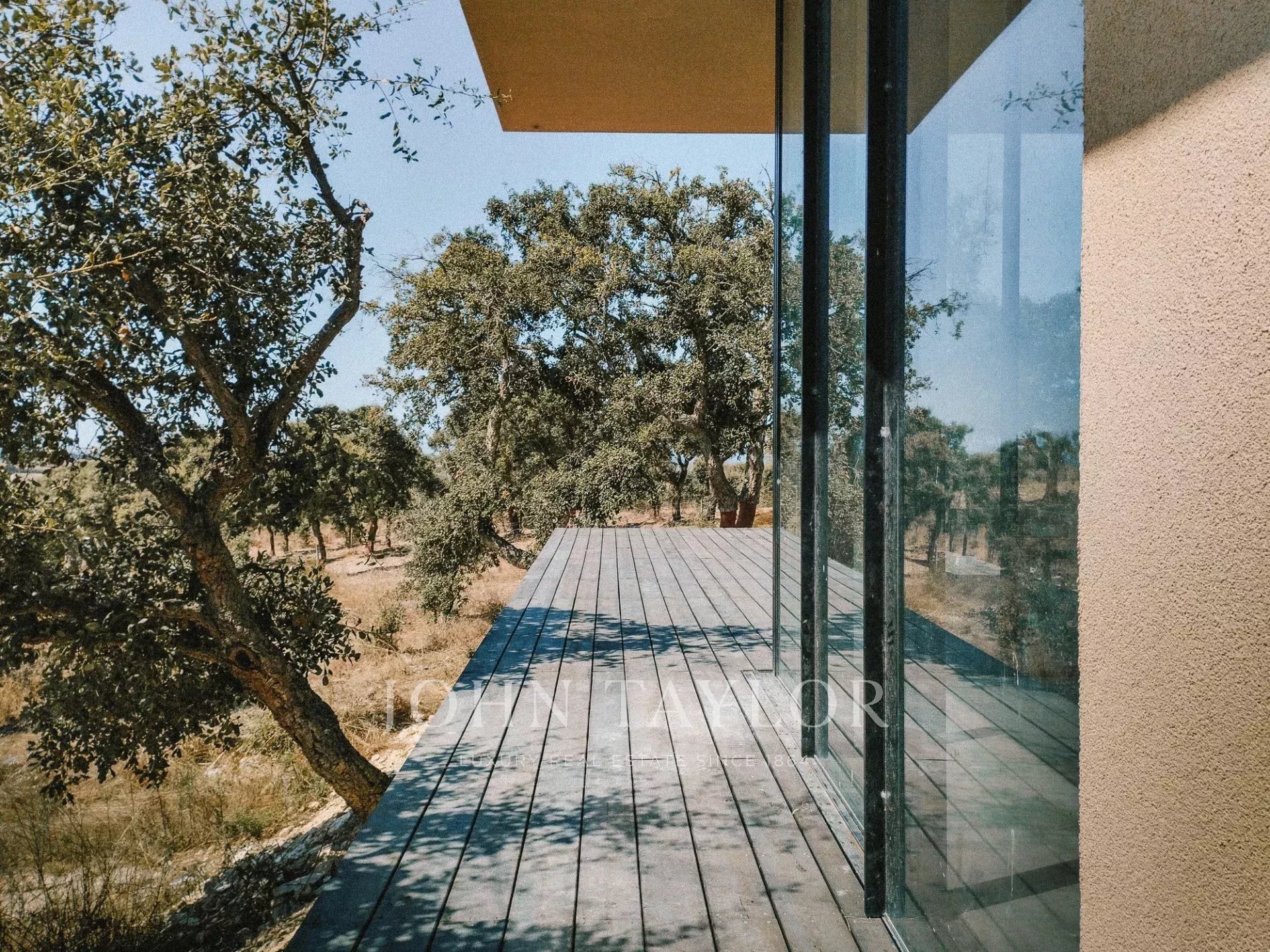 No exterior, existe um espaço de lazer com vistas desafogadas sobre o montado de sobro.