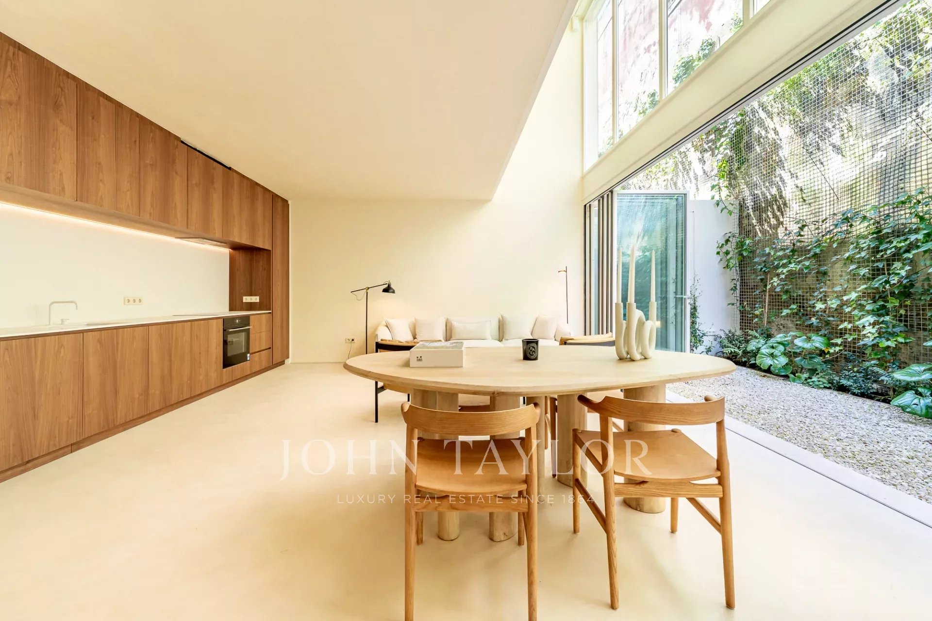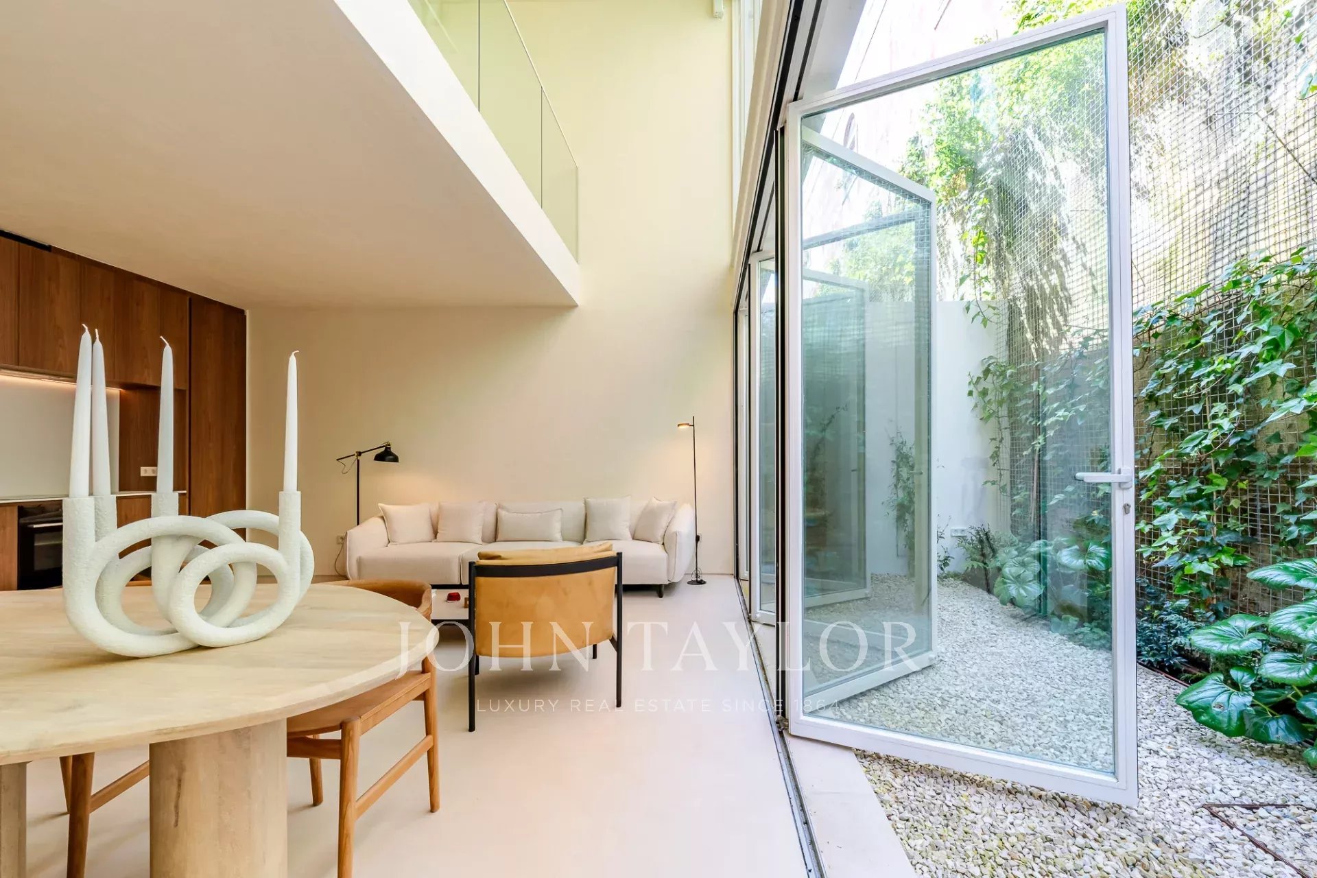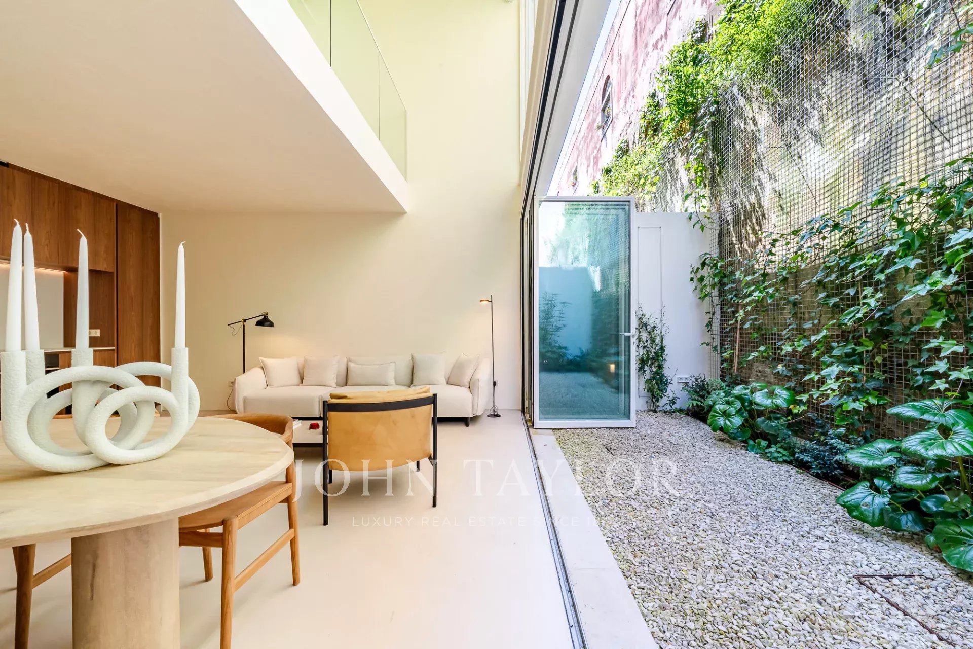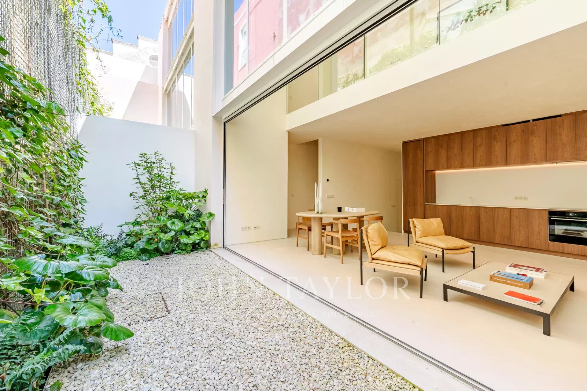 A moradia está distribuída por três pisos. No piso de entrada, a sala de estar, integrada com a cozinha aberta e com pé direito duplo, abre diretamente para um pátio através de uma janela que recolhe totalmente, criando uma ligação com o exterior e proporcionando um ambiente arejado e luminoso. Este piso conta ainda com um WC de serviço e uma lavandaria.