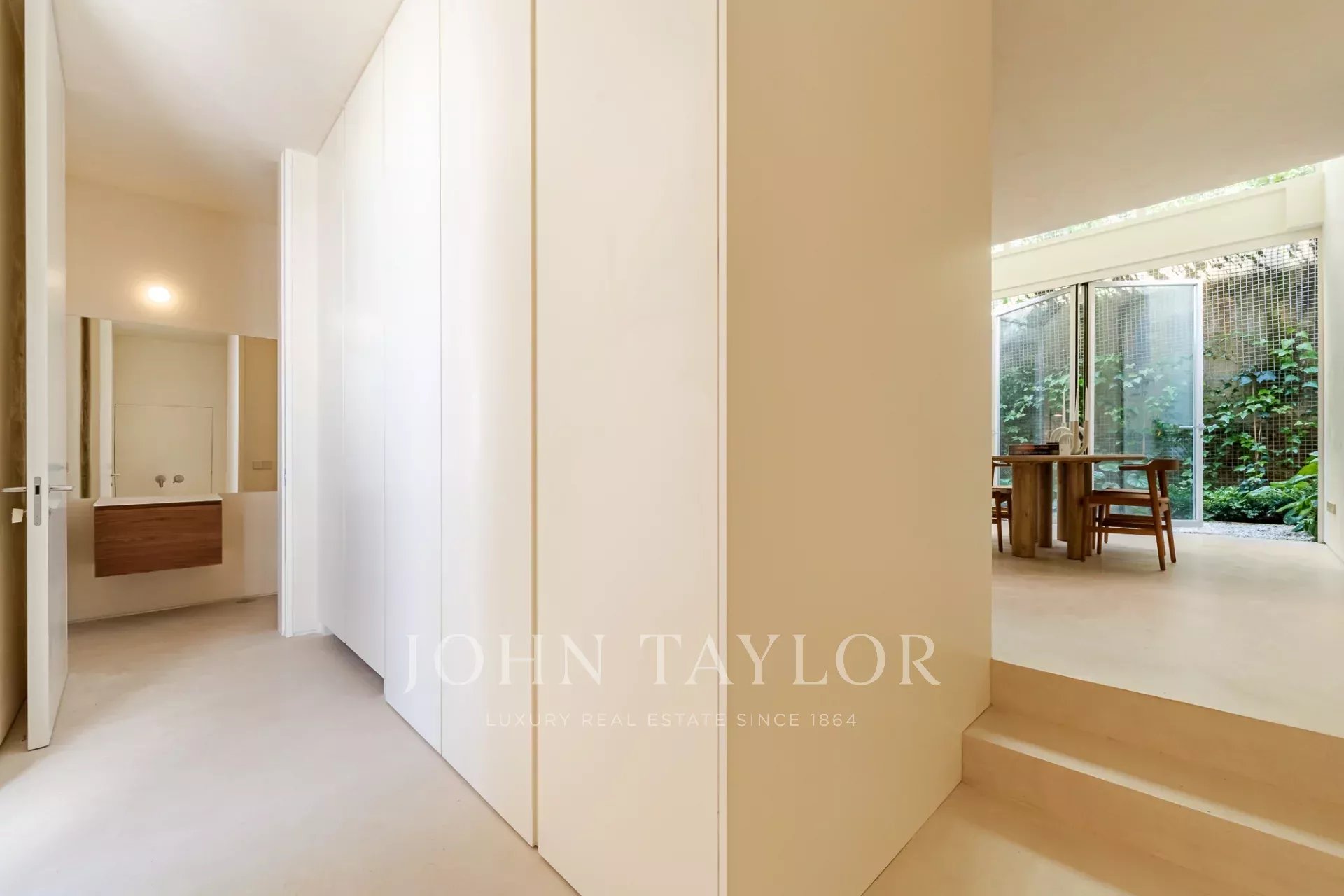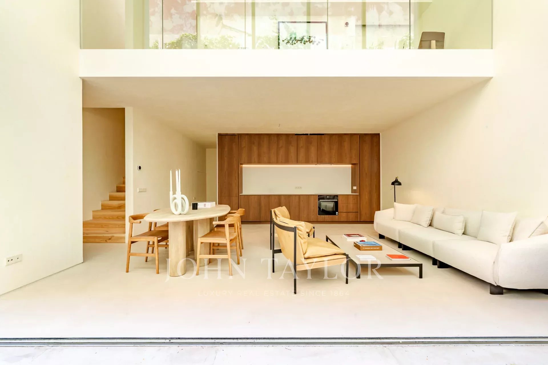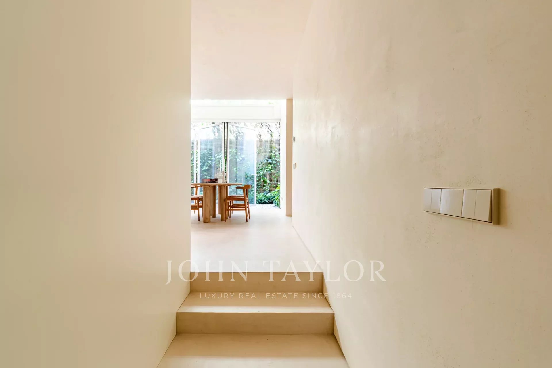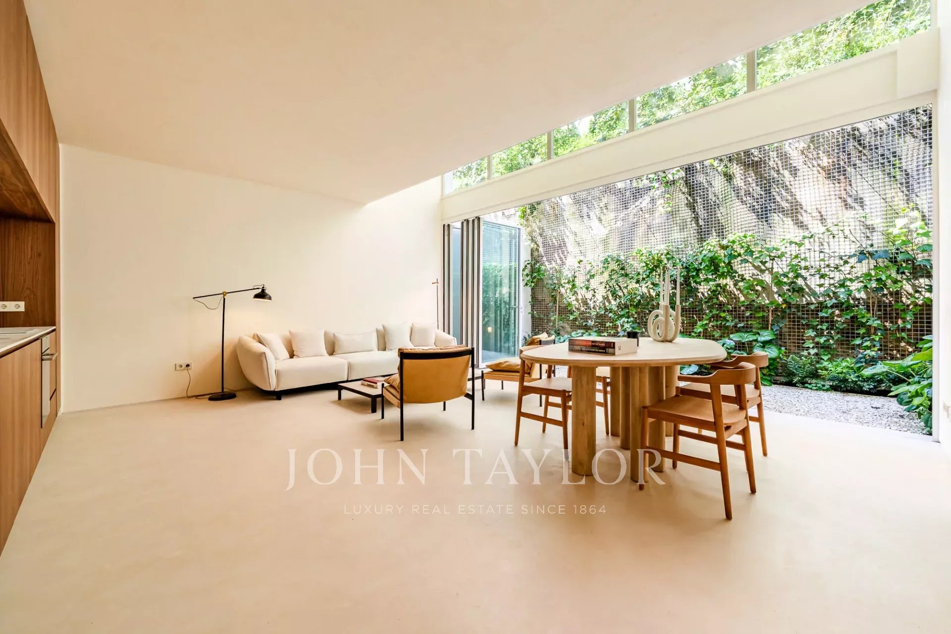 A moradia está distribuída por três pisos. No piso de entrada, a sala de estar, integrada com a cozinha aberta e com pé direito duplo, abre diretamente para um pátio através de uma janela que recolhe totalmente, criando uma ligação com o exterior e proporcionando um ambiente arejado e luminoso. Este piso conta ainda com um WC de serviço e uma lavandaria.