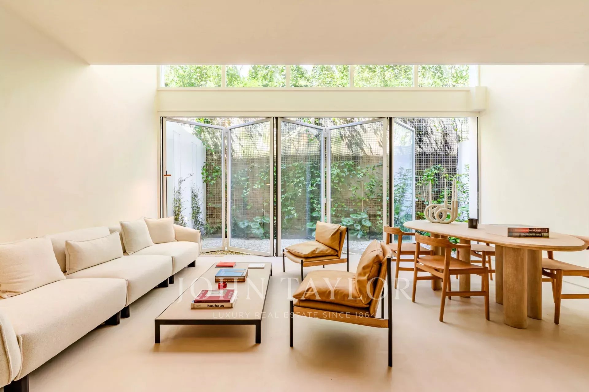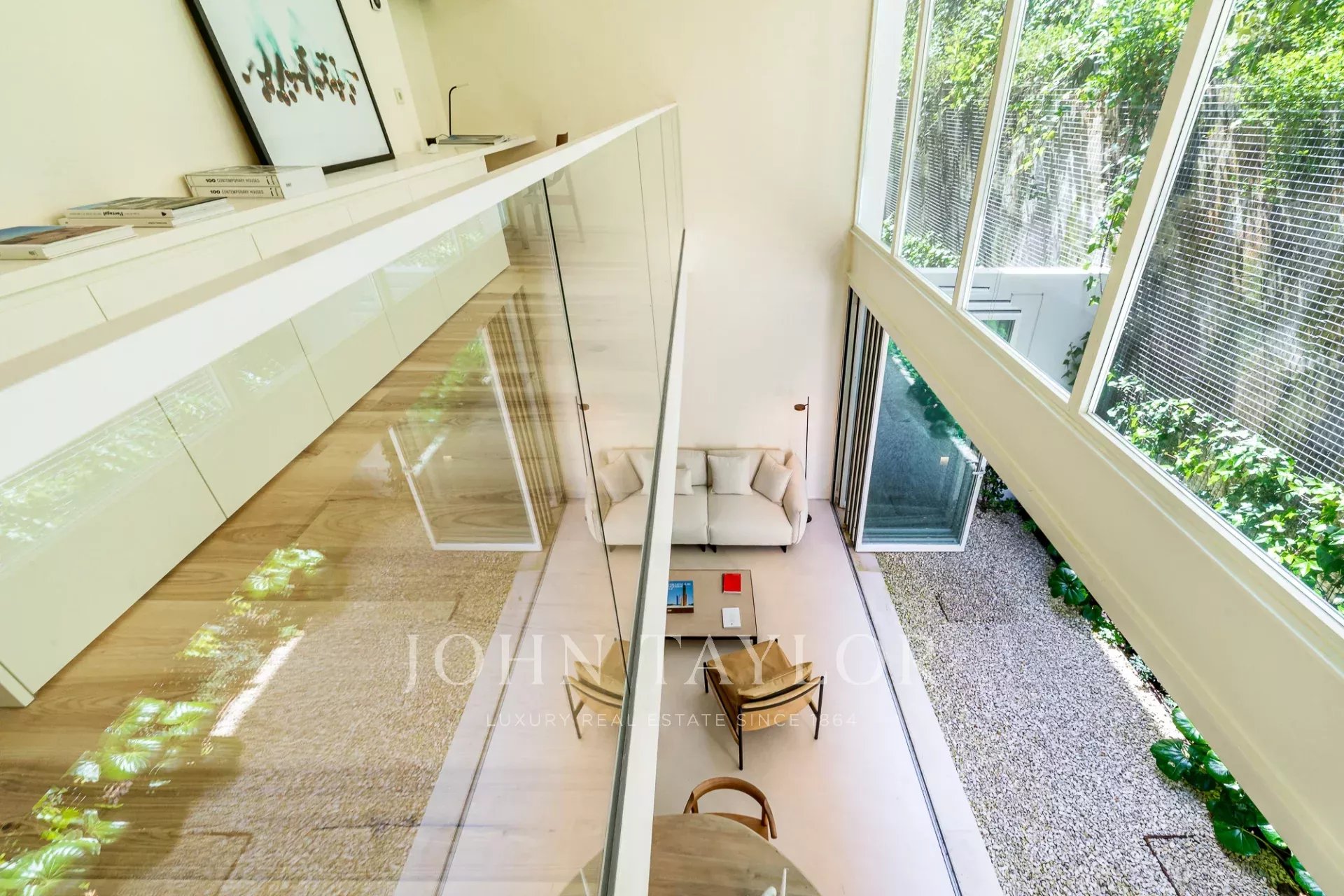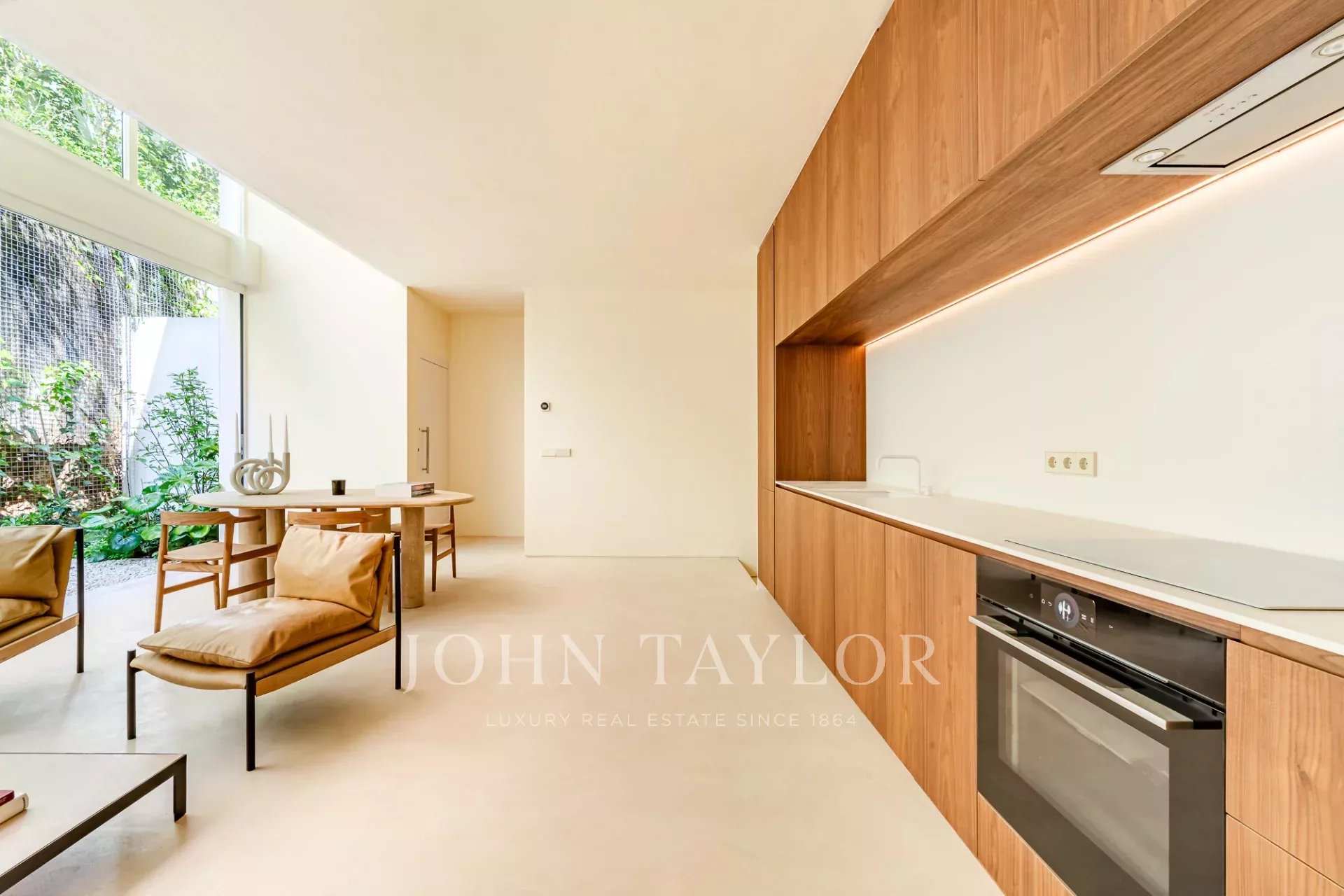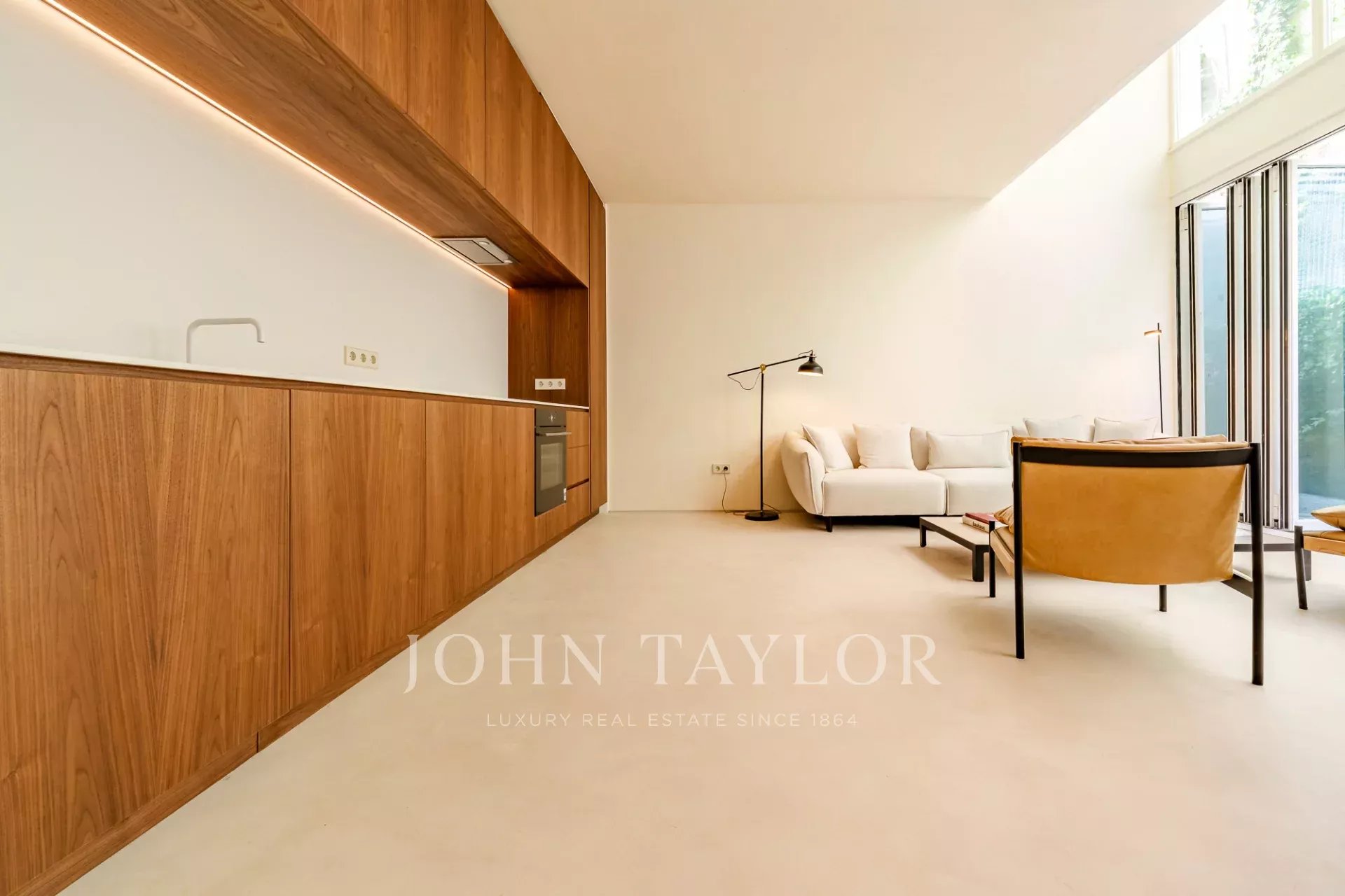 A moradia está distribuída por três pisos. No piso de entrada, a sala de estar, integrada com a cozinha aberta e com pé direito duplo, abre diretamente para um pátio através de uma janela que recolhe totalmente, criando uma ligação com o exterior e proporcionando um ambiente arejado e luminoso. Este piso conta ainda com um WC de serviço e uma lavandaria.
