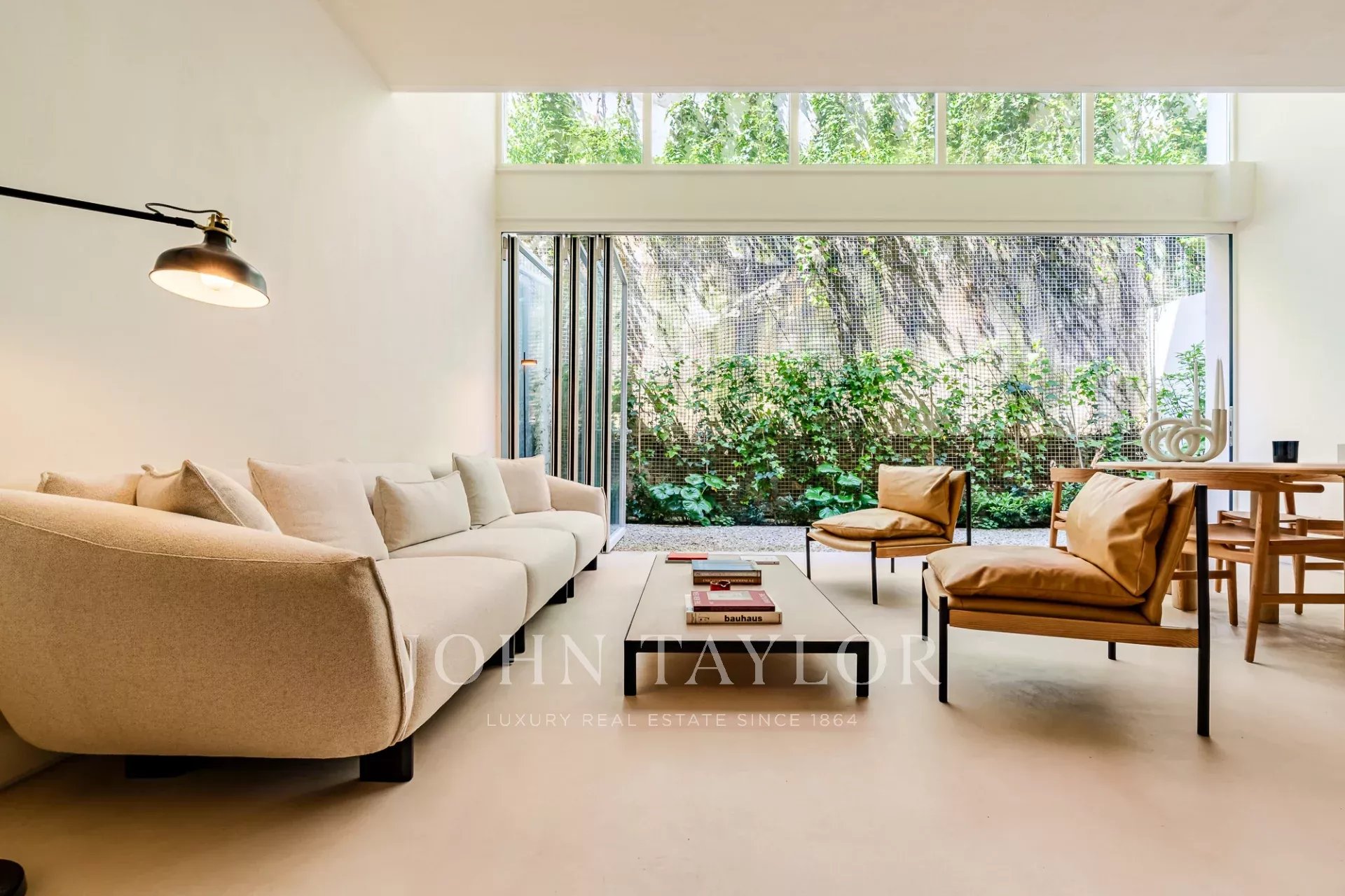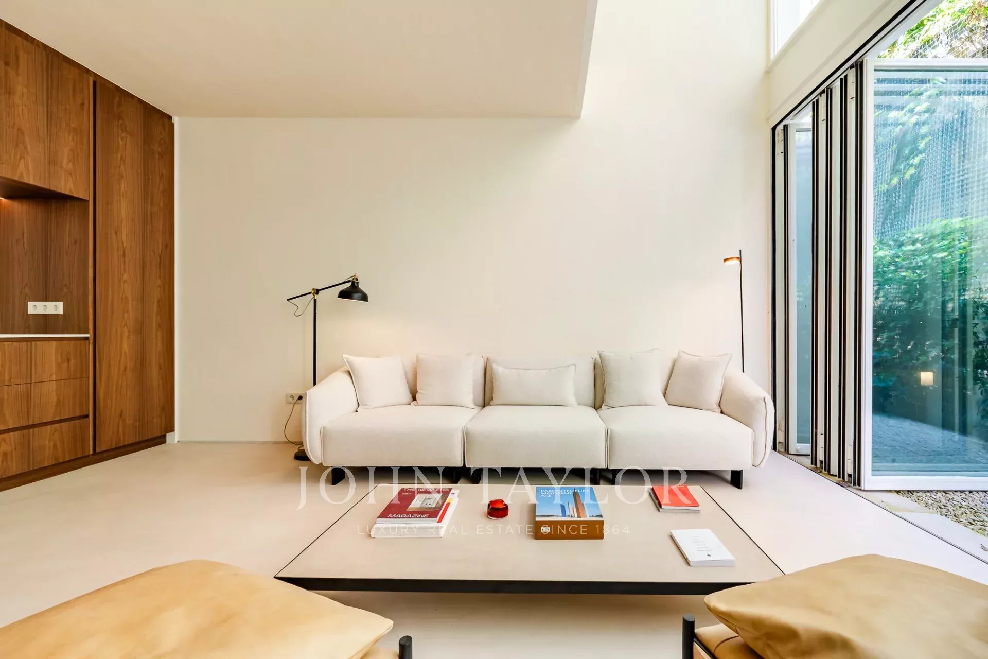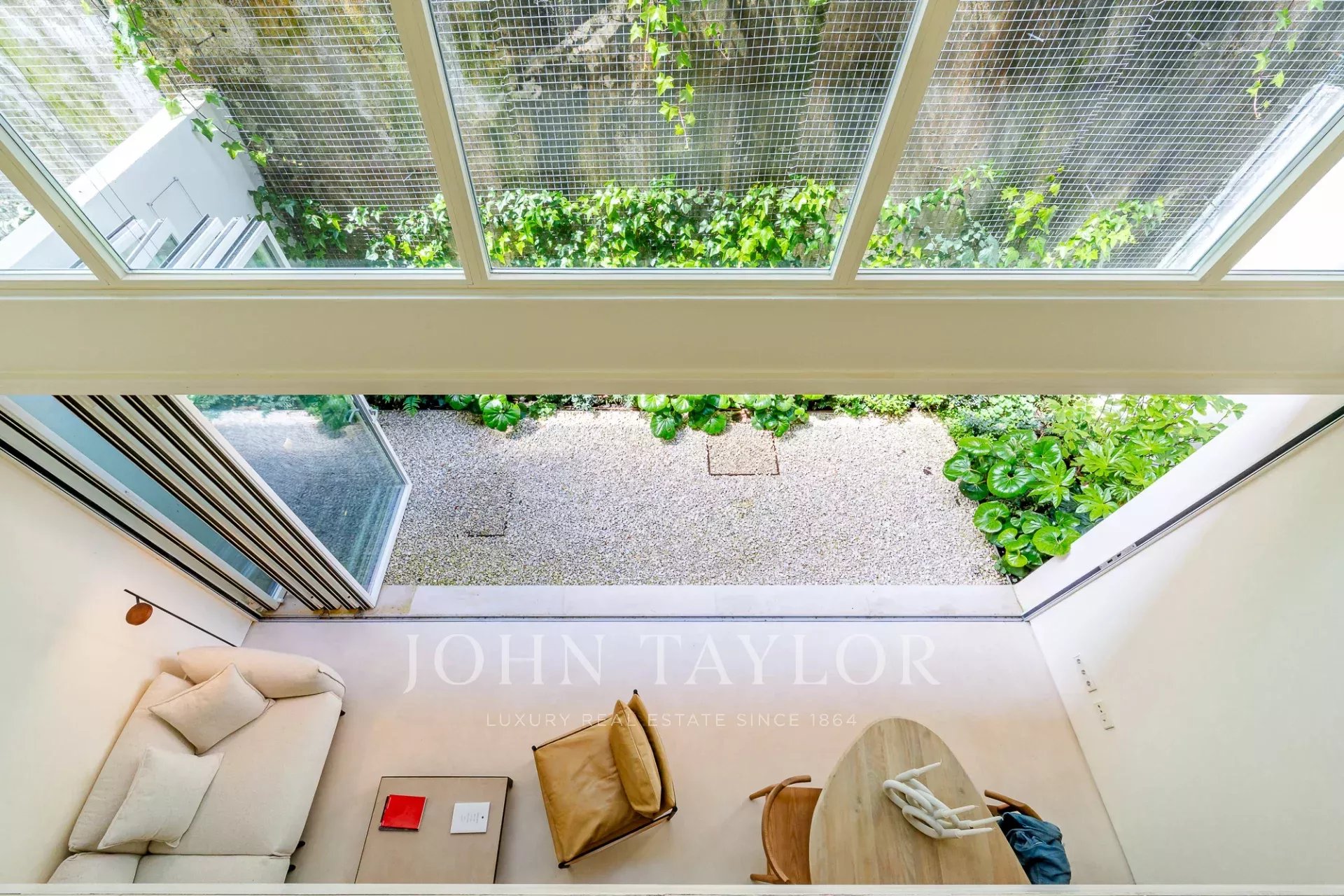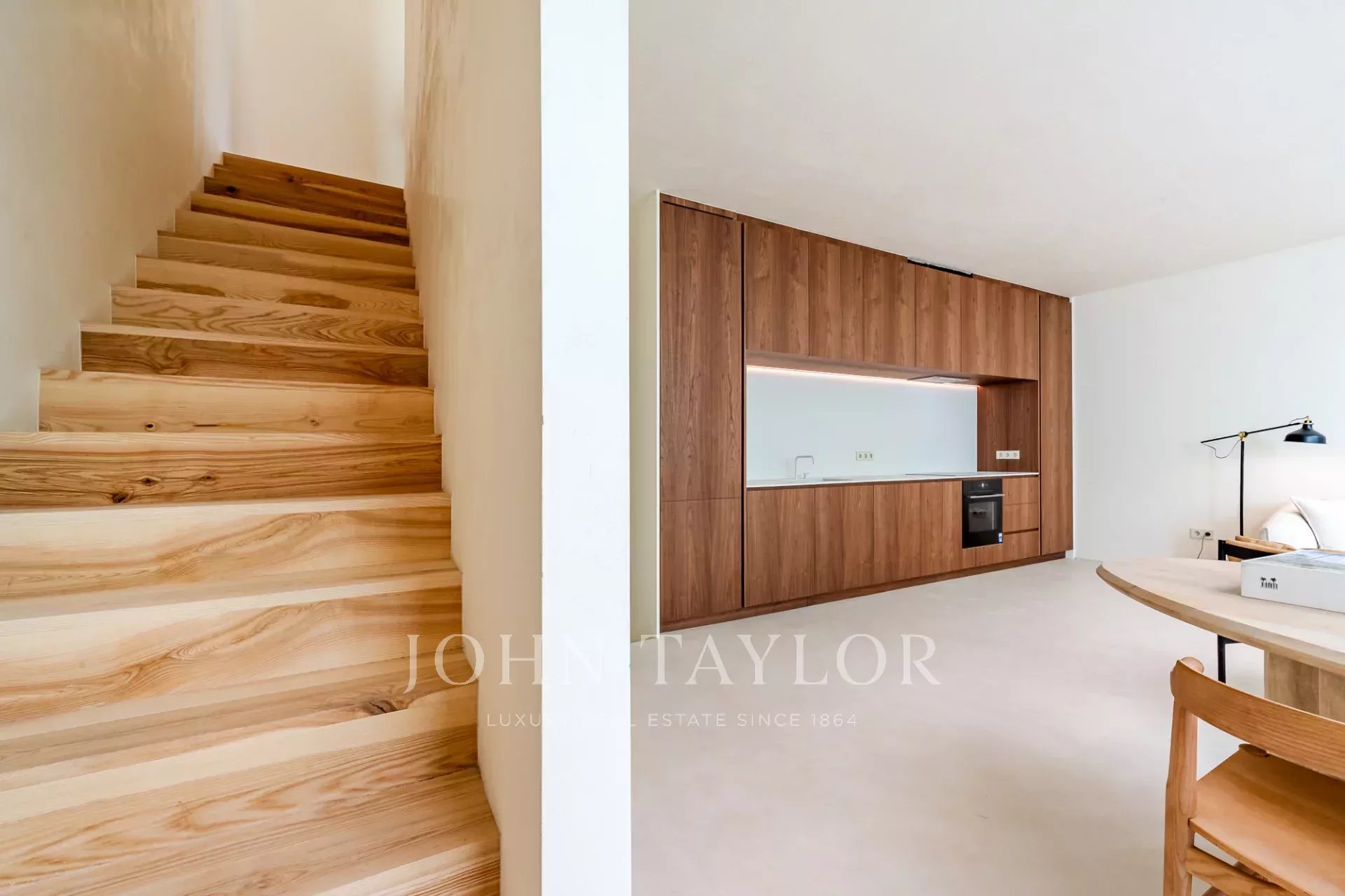A moradia está distribuída por três pisos. No piso de entrada, a sala de estar, integrada com a cozinha aberta e com pé direito duplo, abre diretamente para um pátio através de uma janela que recolhe totalmente, criando uma ligação com o exterior e proporcionando um ambiente arejado e luminoso. Este piso conta ainda com um WC de serviço e uma lavandaria.