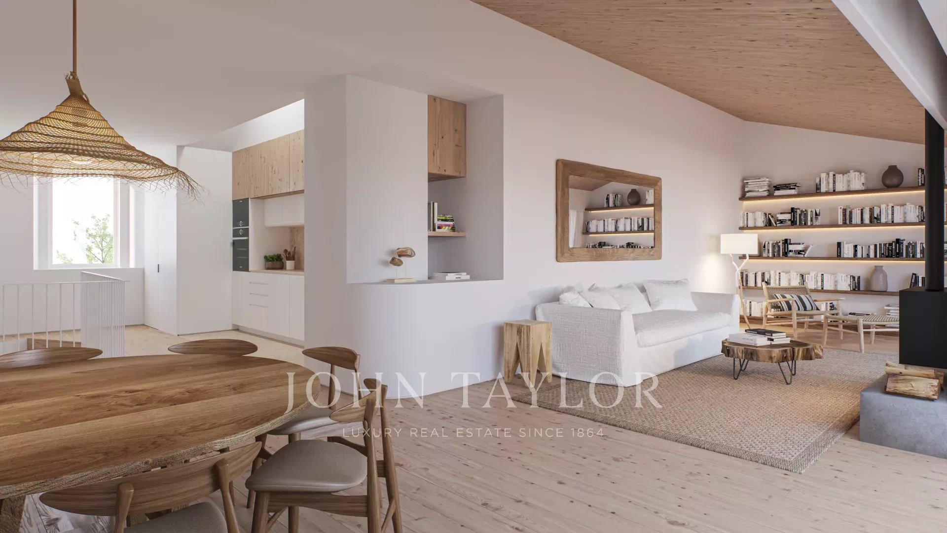 Segundo andar com cozinha aberta, sala de jantar e sala de estar, casa de banho social e acesso a um terraço exterior que inclui uma piscina e lareira exterior.