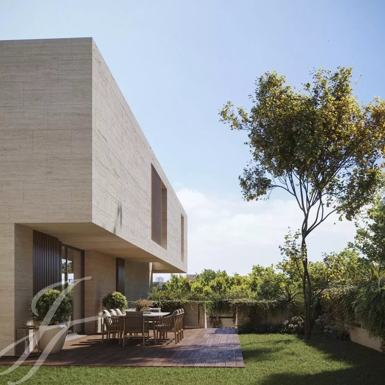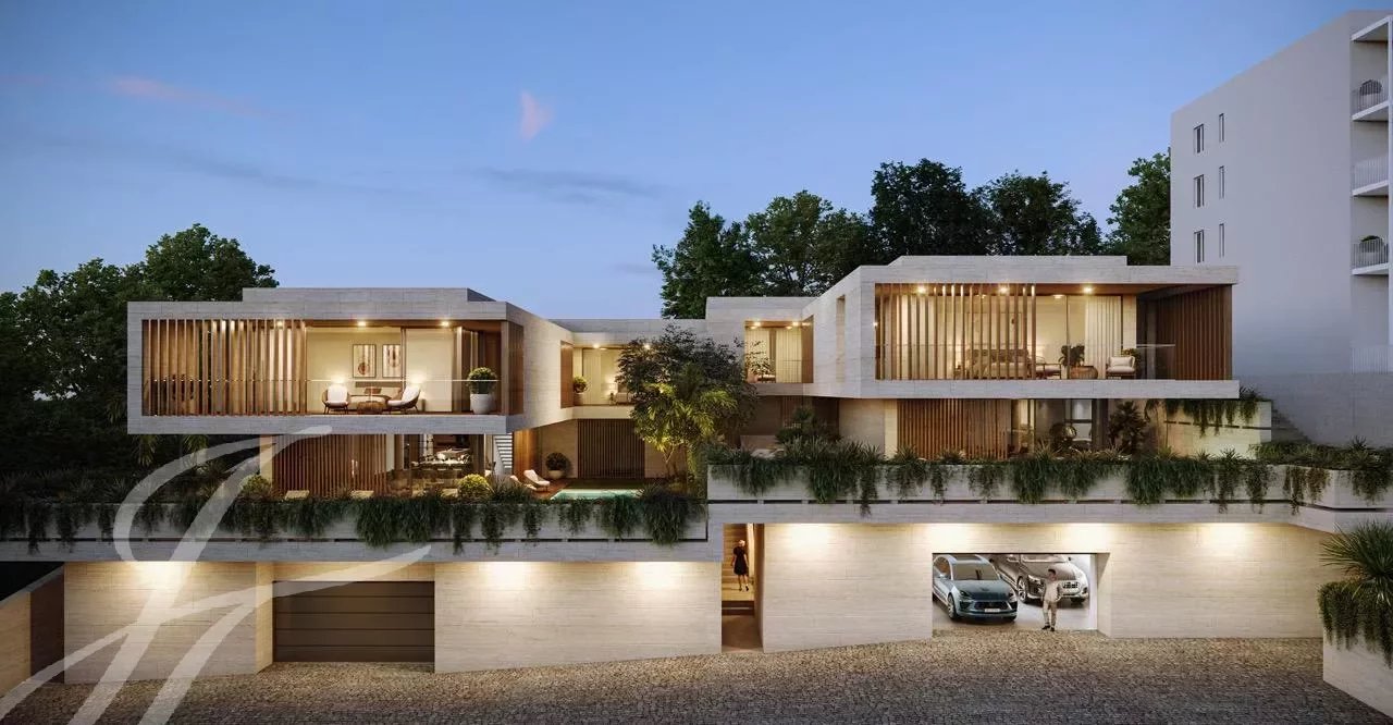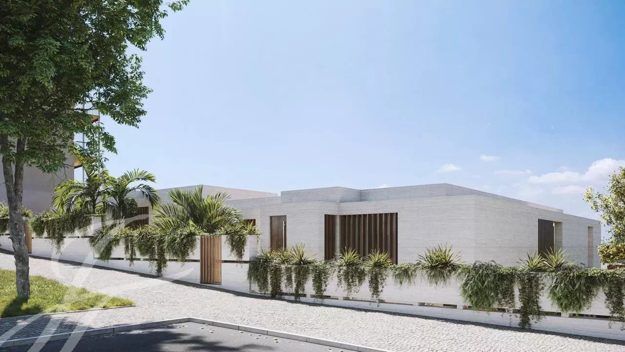 Terreno com 1.379 m², com projeto de arquitetura aprovado para a construção de duas moradias geminadas, cada uma com jardim e piscina privativos.