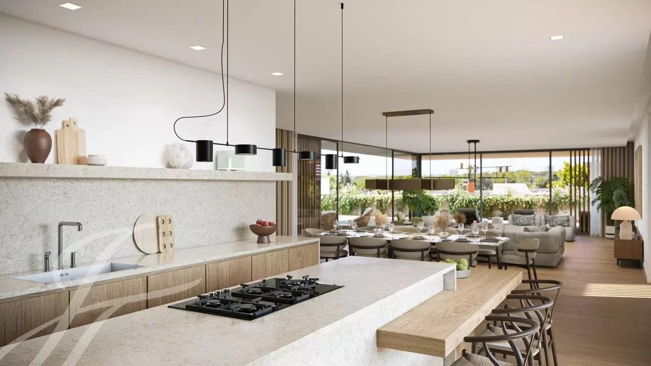 O projeto contempla uma cave com garagem para quatro viaturas, zona técnica, arrumos e uma suite com luz natural, áreas sociais no piso térreo, zona privada de quartos no piso superior, e um terraço na cobertura com 84 m² e vistas desafogadas.