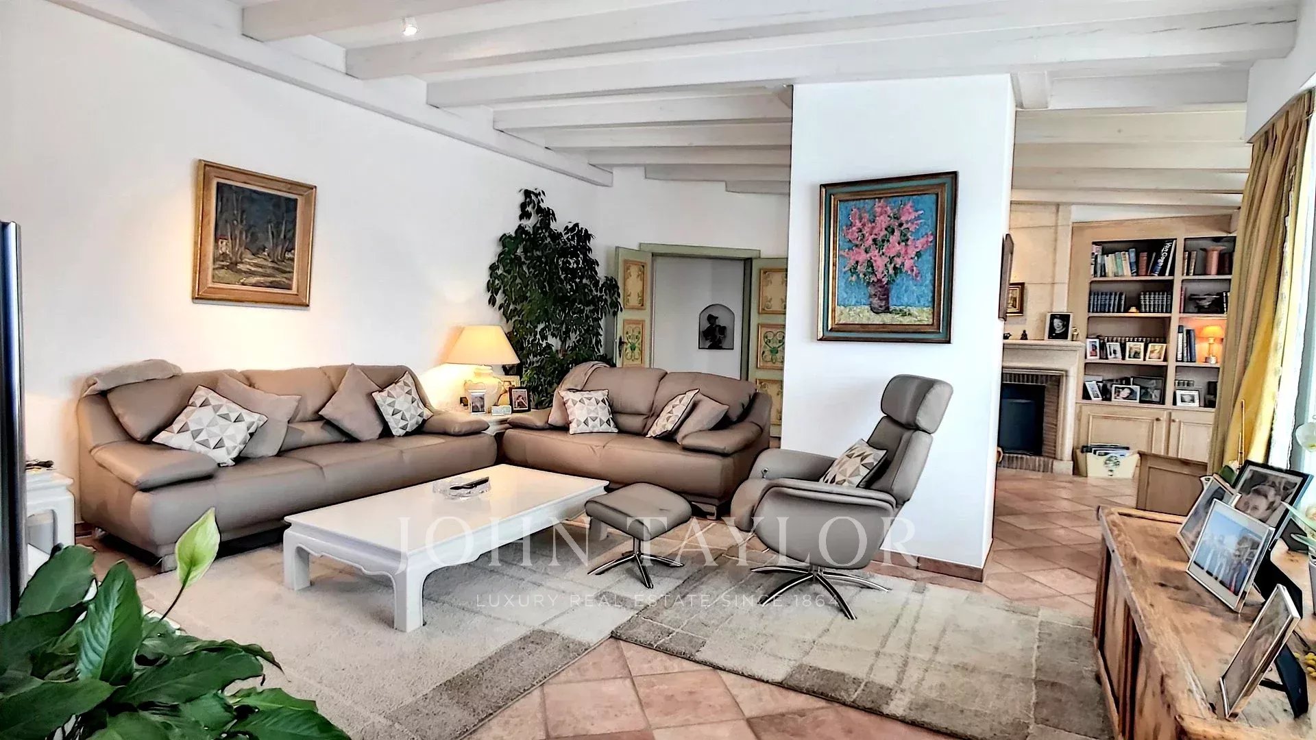 - 1 sala de estar ampla com lareira e área de biblioteca