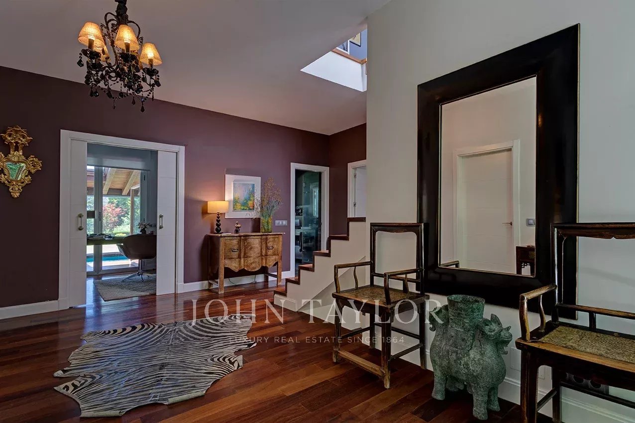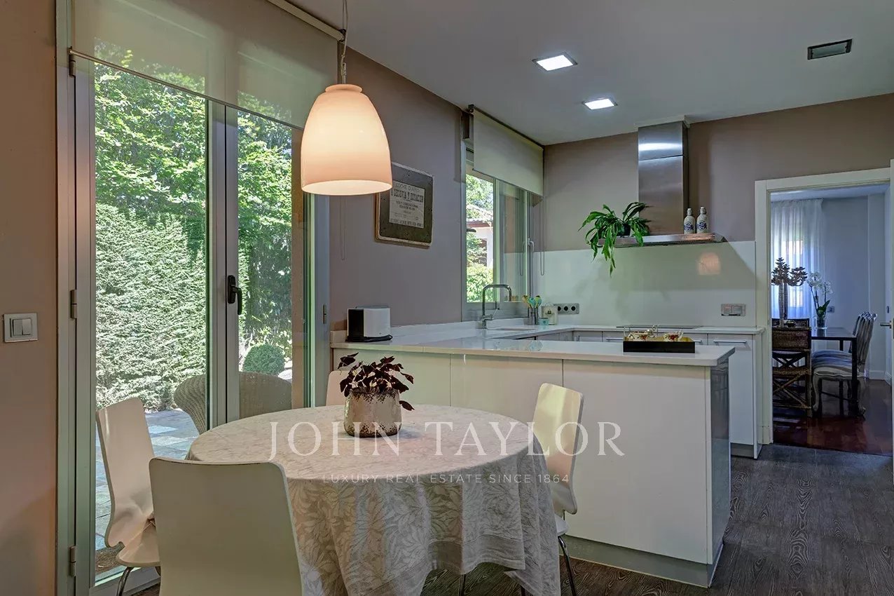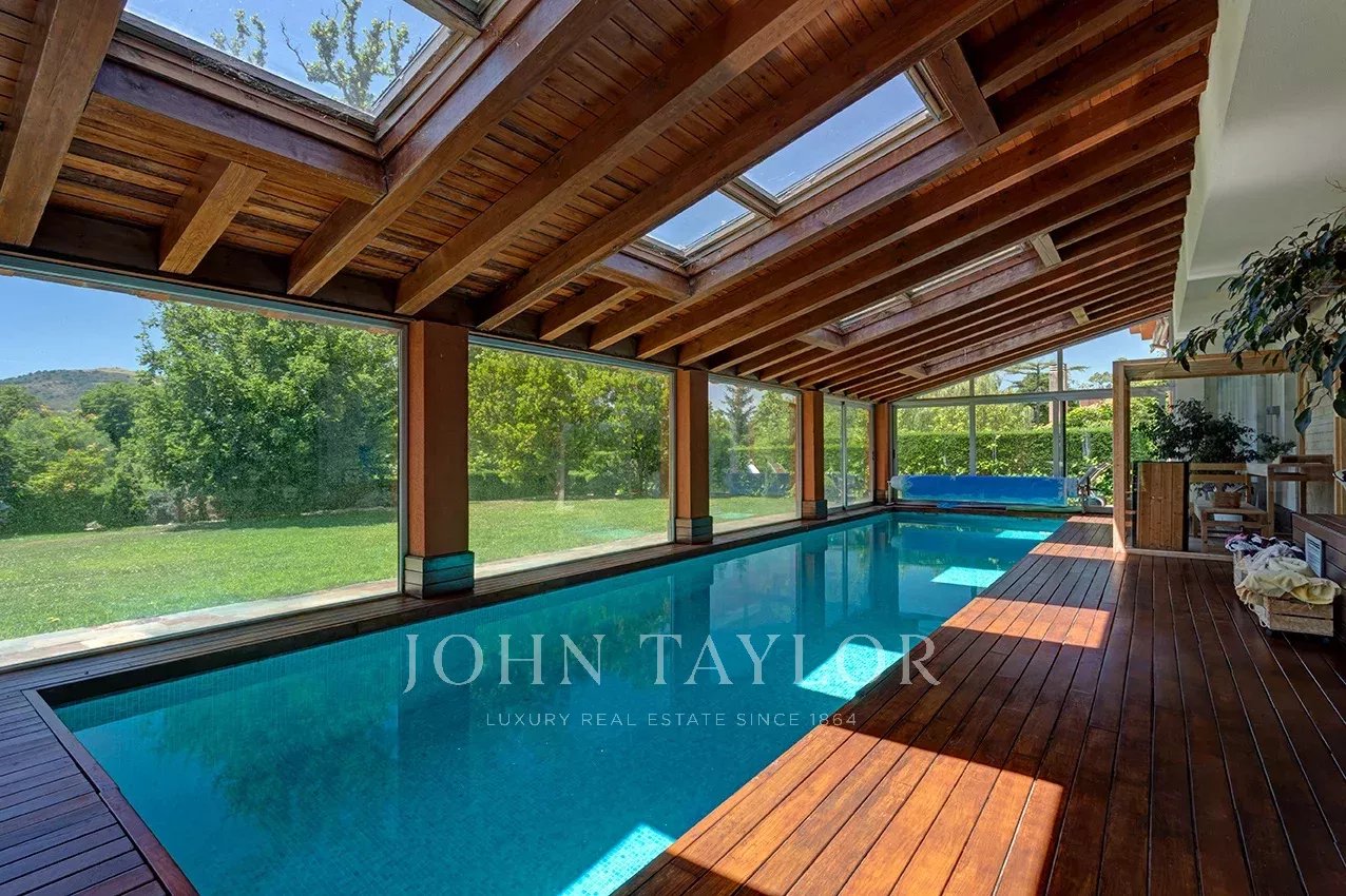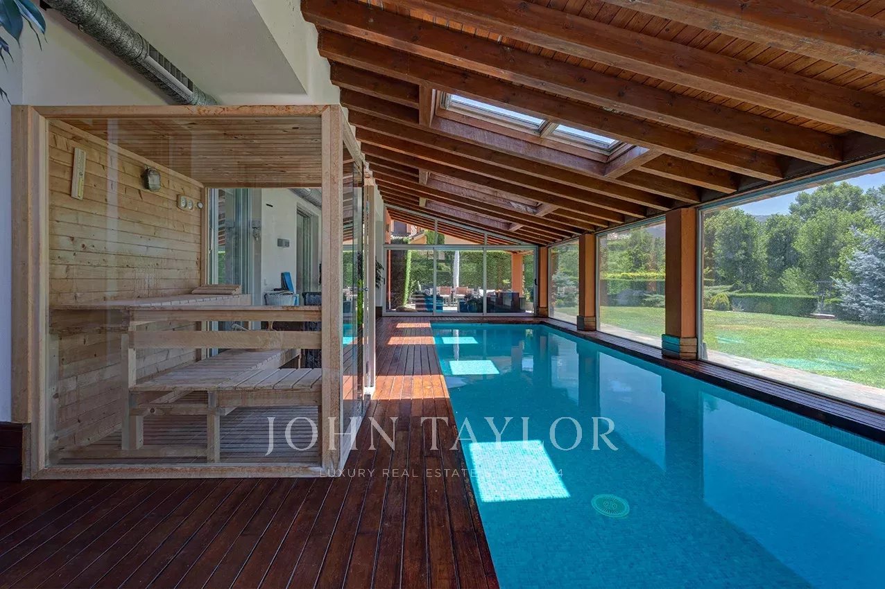 Distribuída em três confortáveis pisos, o piso principal é composto por uma ampla e luminosa sala de estar com lareira e grandes janelas com acesso ao jardim e à magnífica piscina coberta e envidraçada, aquecida, com sistema de desumidificação, que, no verão pode ser semi exterior para poder abrir todo o recinto envidraçado.
