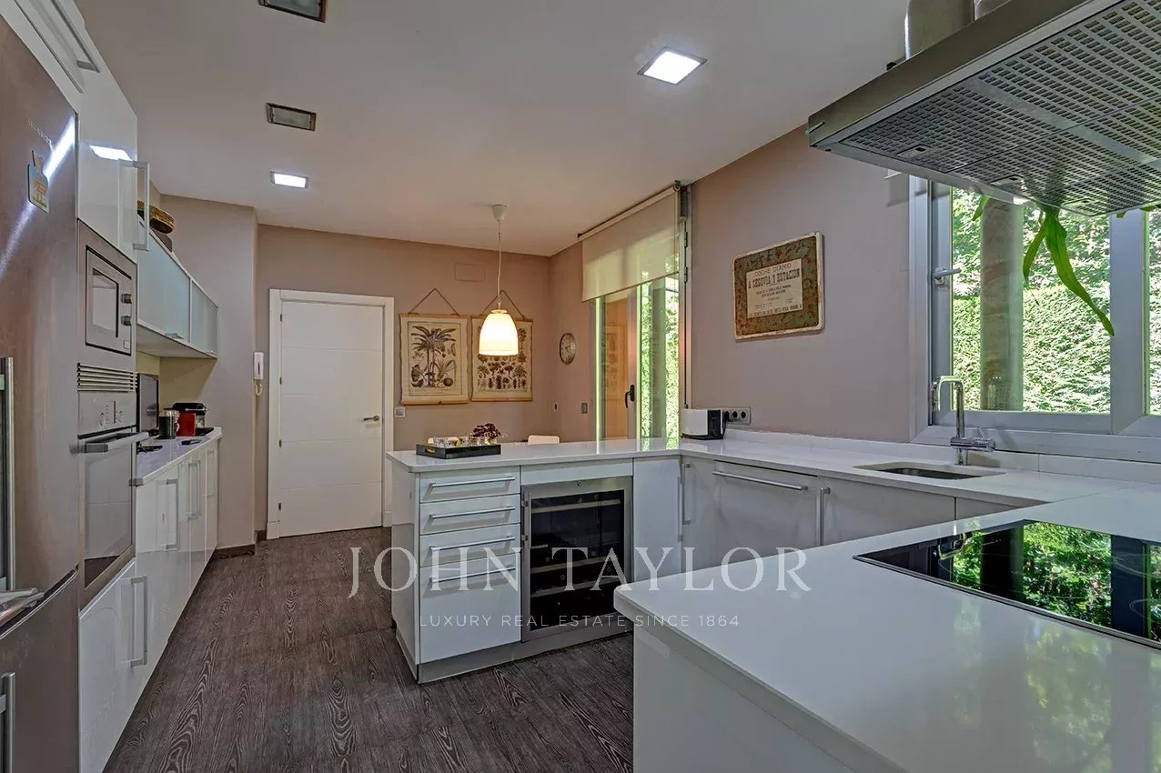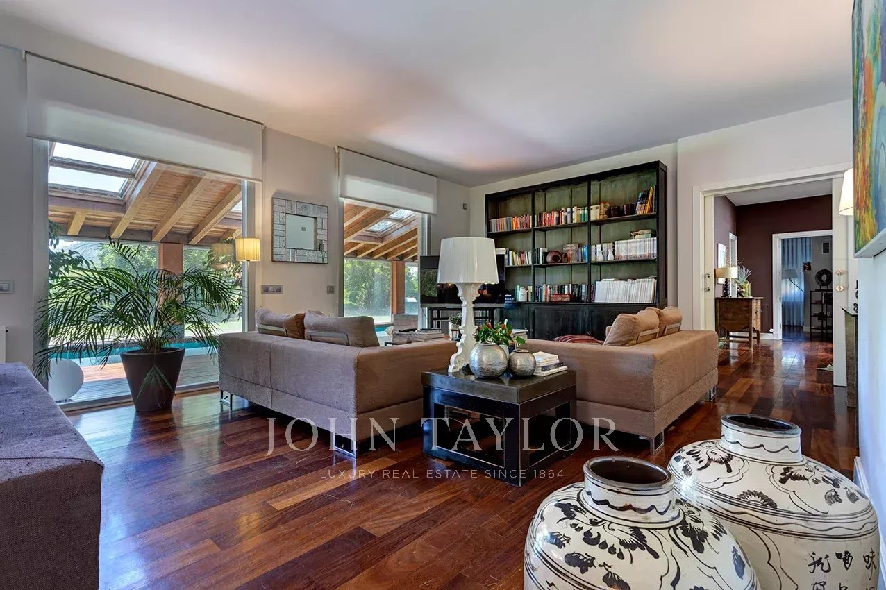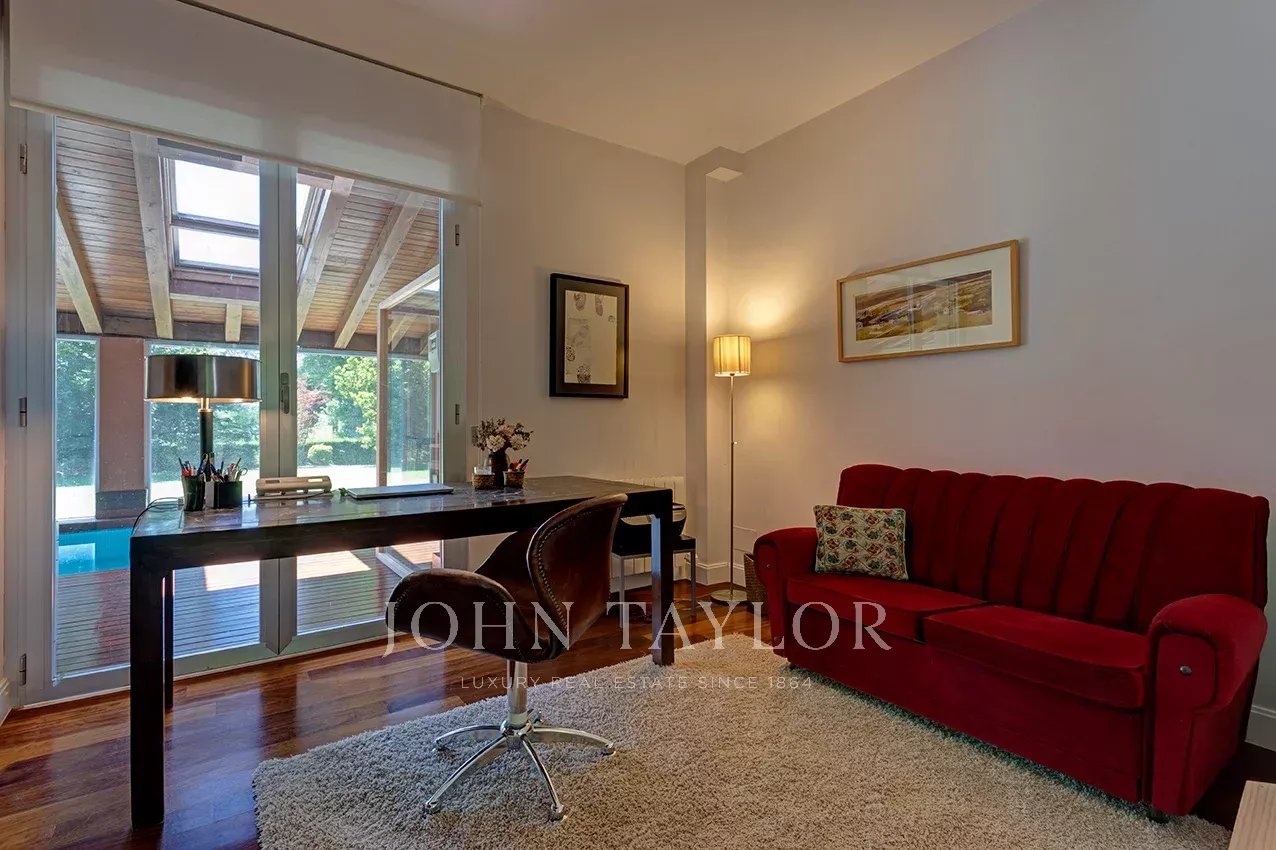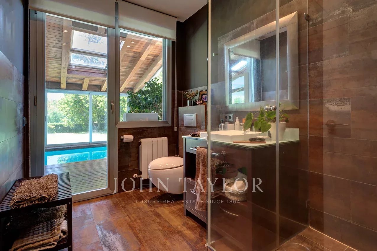 Distribuída em três confortáveis pisos, o piso principal é composto por uma ampla e luminosa sala de estar com lareira e grandes janelas com acesso ao jardim e à magnífica piscina coberta e envidraçada, aquecida, com sistema de desumidificação, que, no verão pode ser semi exterior para poder abrir todo o recinto envidraçado.