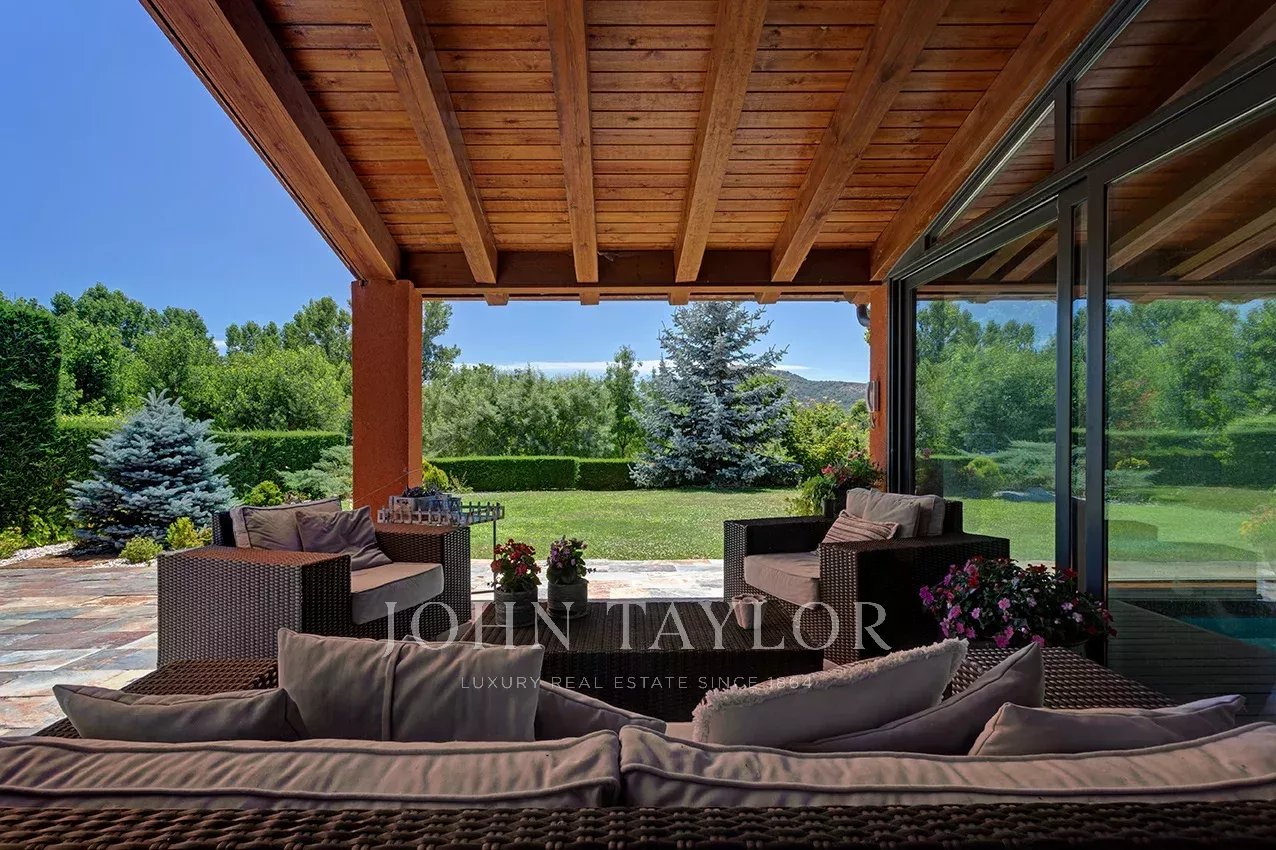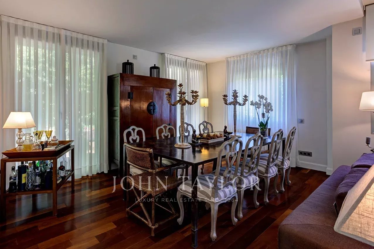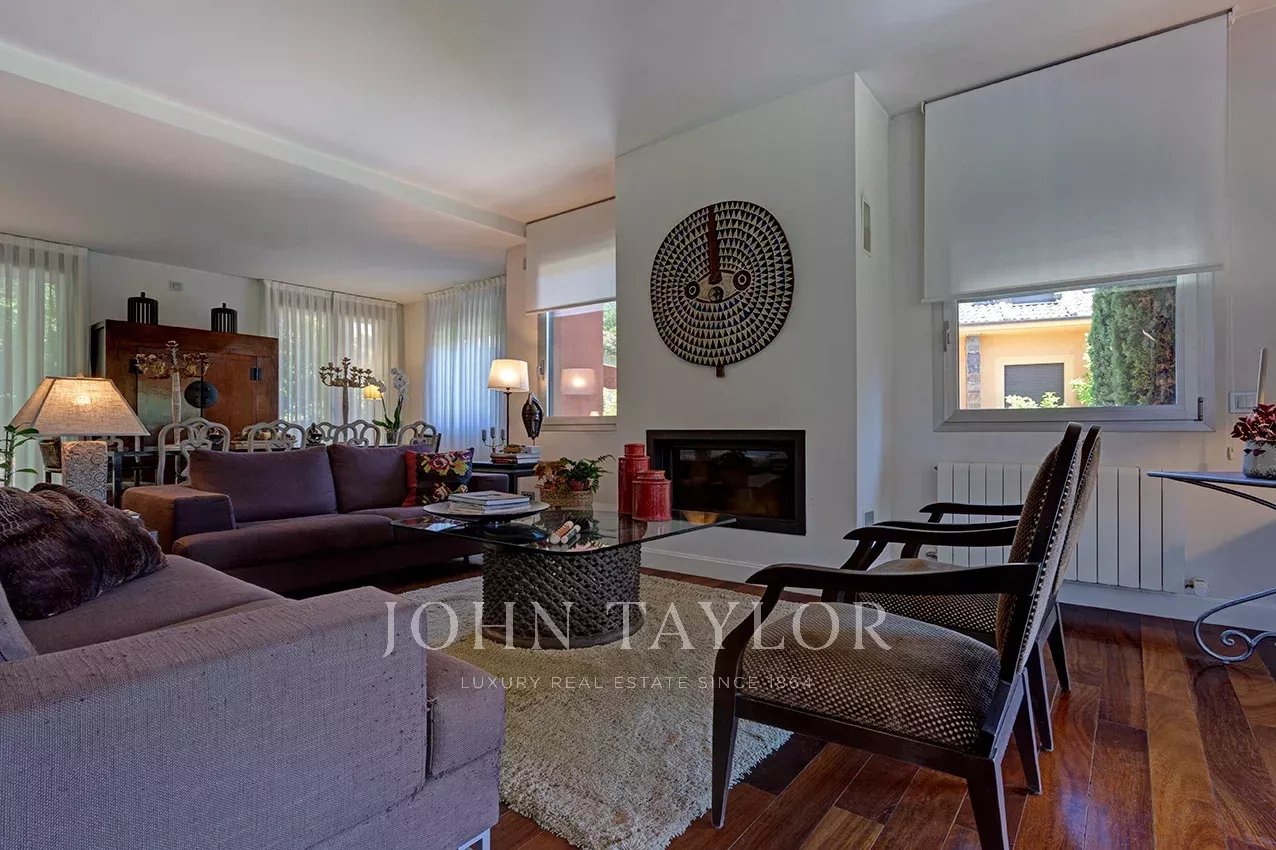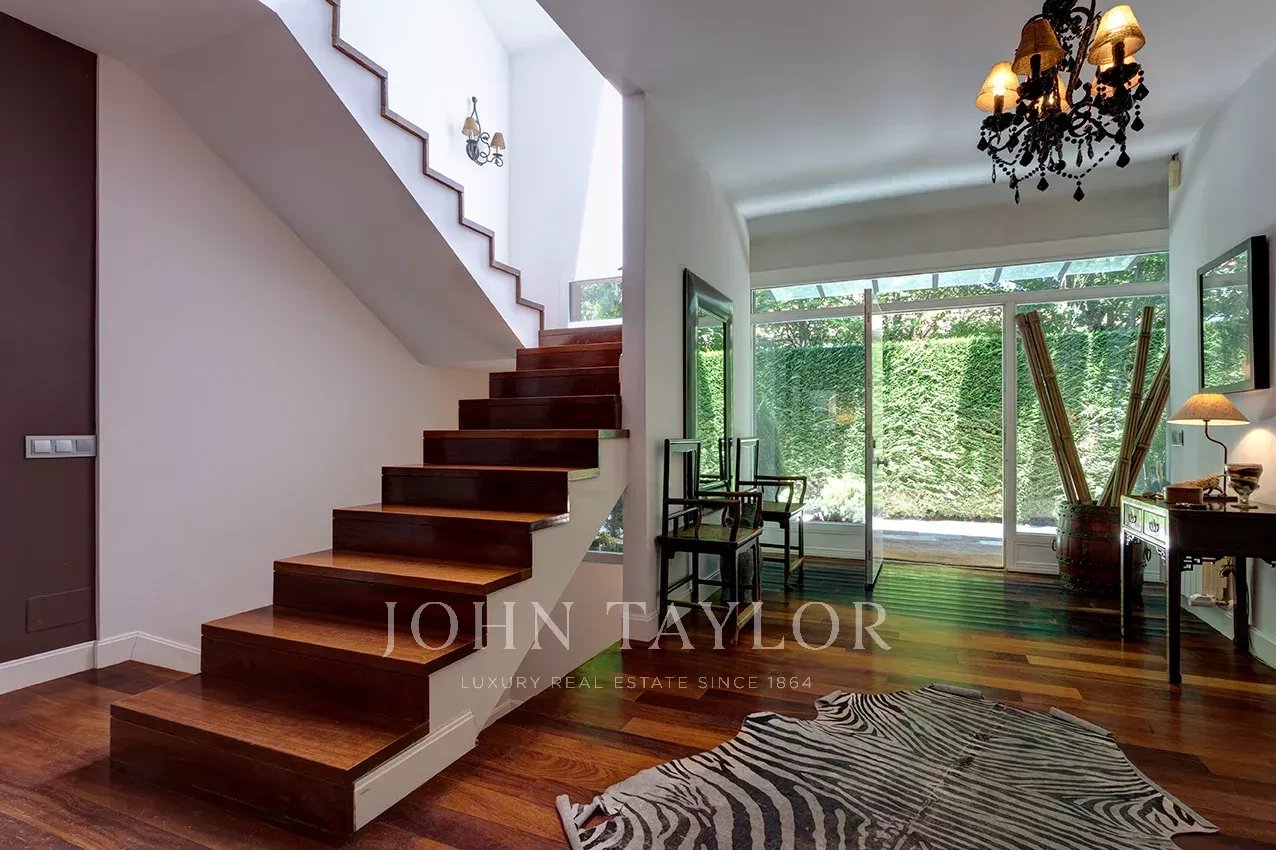 Distribuída em três confortáveis pisos, o piso principal é composto por uma ampla e luminosa sala de estar com lareira e grandes janelas com acesso ao jardim e à magnífica piscina coberta e envidraçada, aquecida, com sistema de desumidificação, que, no verão pode ser semi exterior para poder abrir todo o recinto envidraçado.